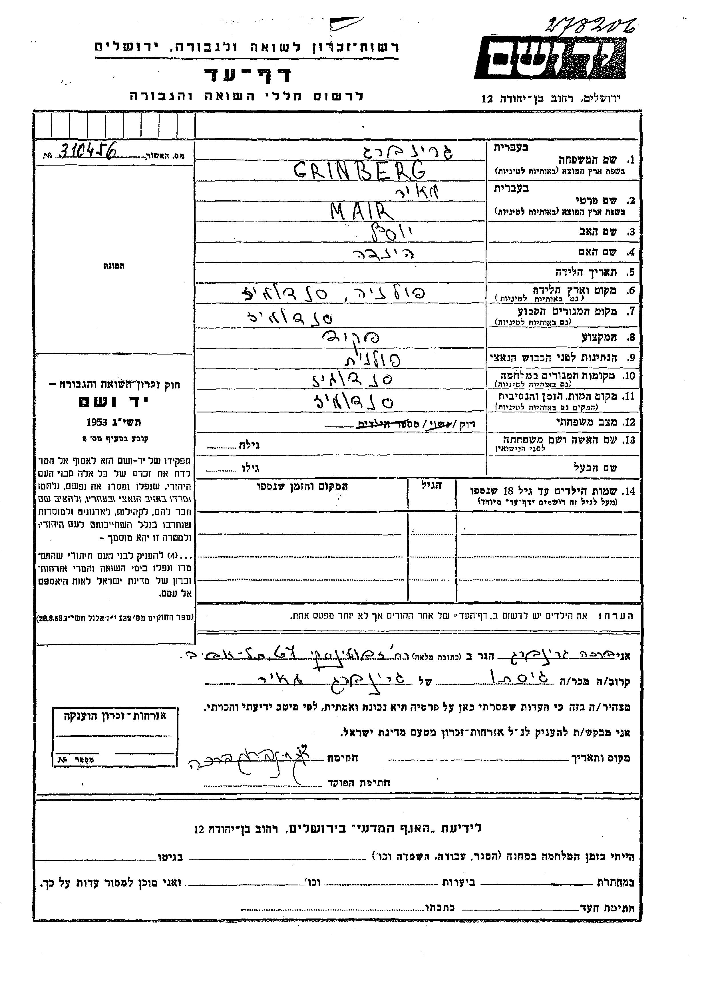 Маир Гринберг, место рождения: Сандомеж, Польша. Отец: Иосеф, mать:Хинда. Клерк. Холост / не замужем. Место жительства до войны: Сандомеж, Польша. Место во время войны: Сандомеж, Польша.