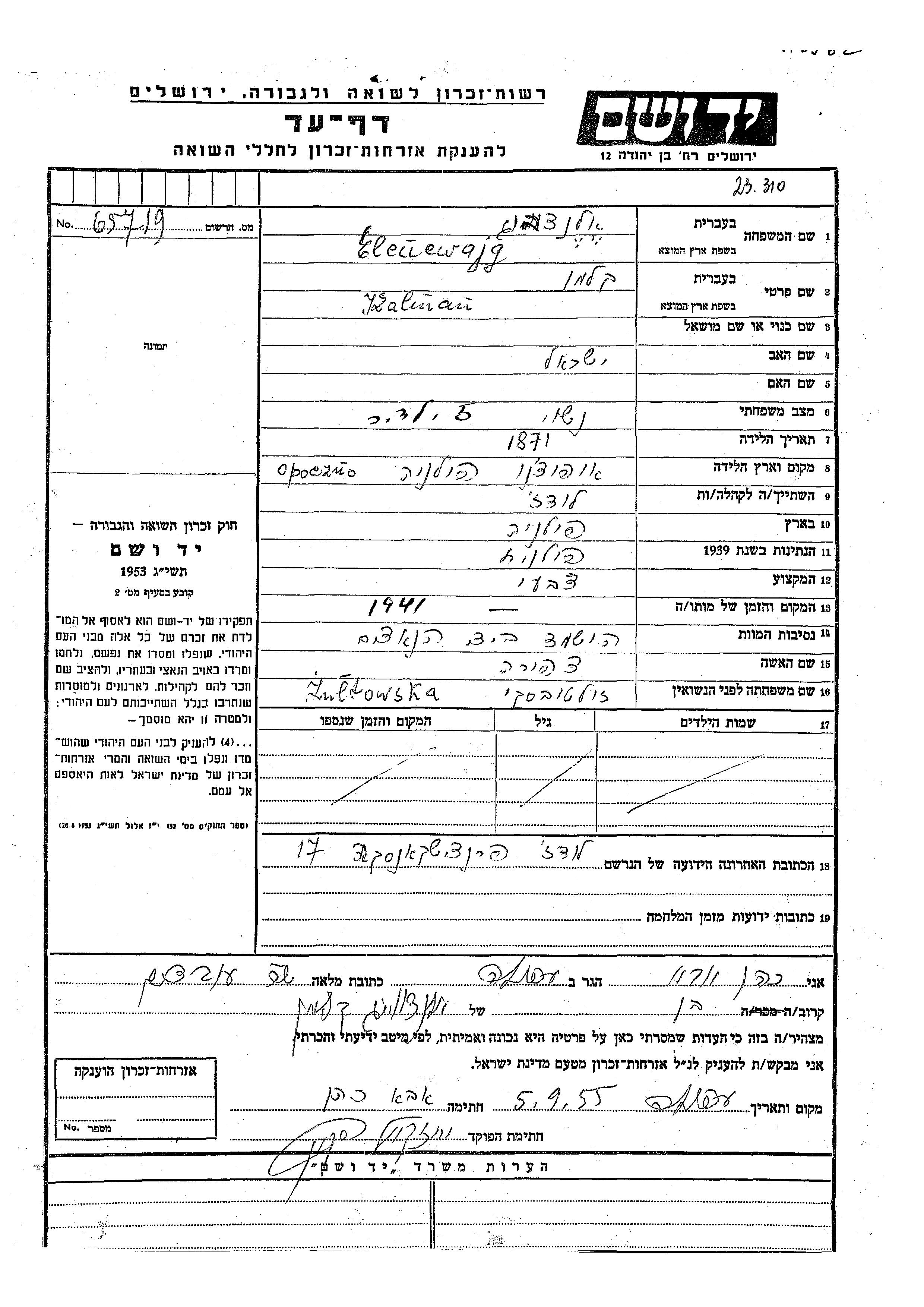 Кальман Эленцвайг, место рождения: Опочно, Польша. Отец: Исраэль. Маляр. Женат / замужем. Место жительства до войны: Лодзь, Польша. Место во время войны: Лодзь, Польша.