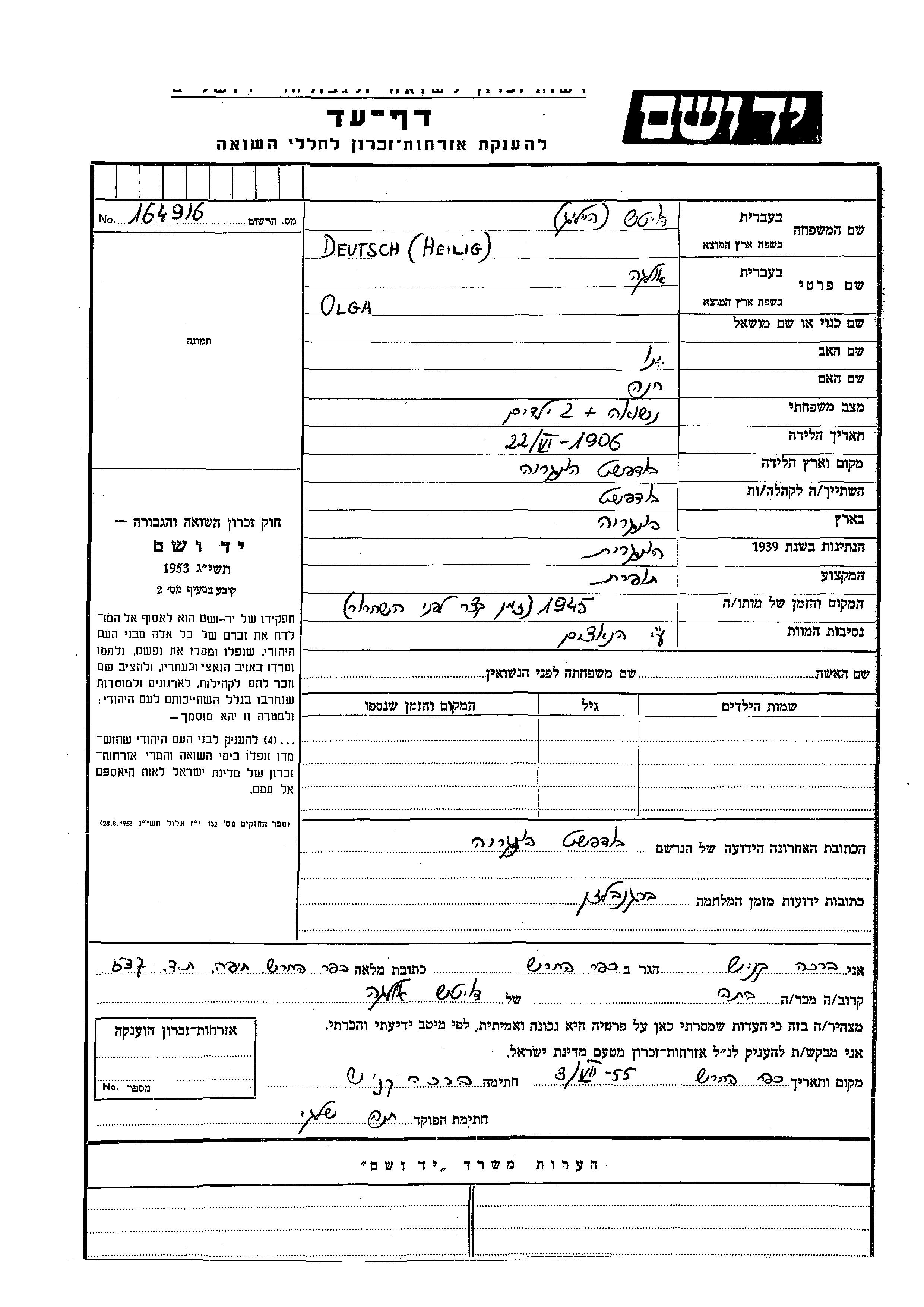 Ольга Дойч Хейлиг, место рождения: Будапешт, Венгрия. Отец: Ено, mать:Хана. Швея. Место жительства до войны: Венгрия. Место во время войны: Берген-Бельзен, Германия.