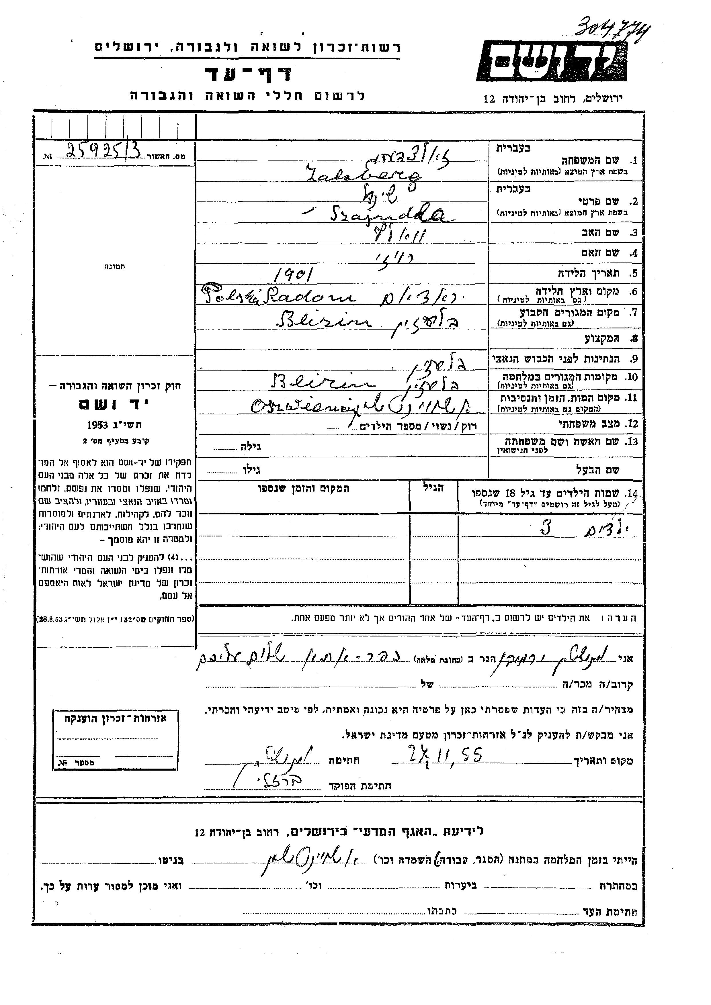 Шайндла Зальцберг, место рождения: Радом, Польша. Отец: Вольф, mать:Ройзи. Женат / замужем. Место жительства до войны: Близин, Польша. Место во время войны: Близин, Польша.