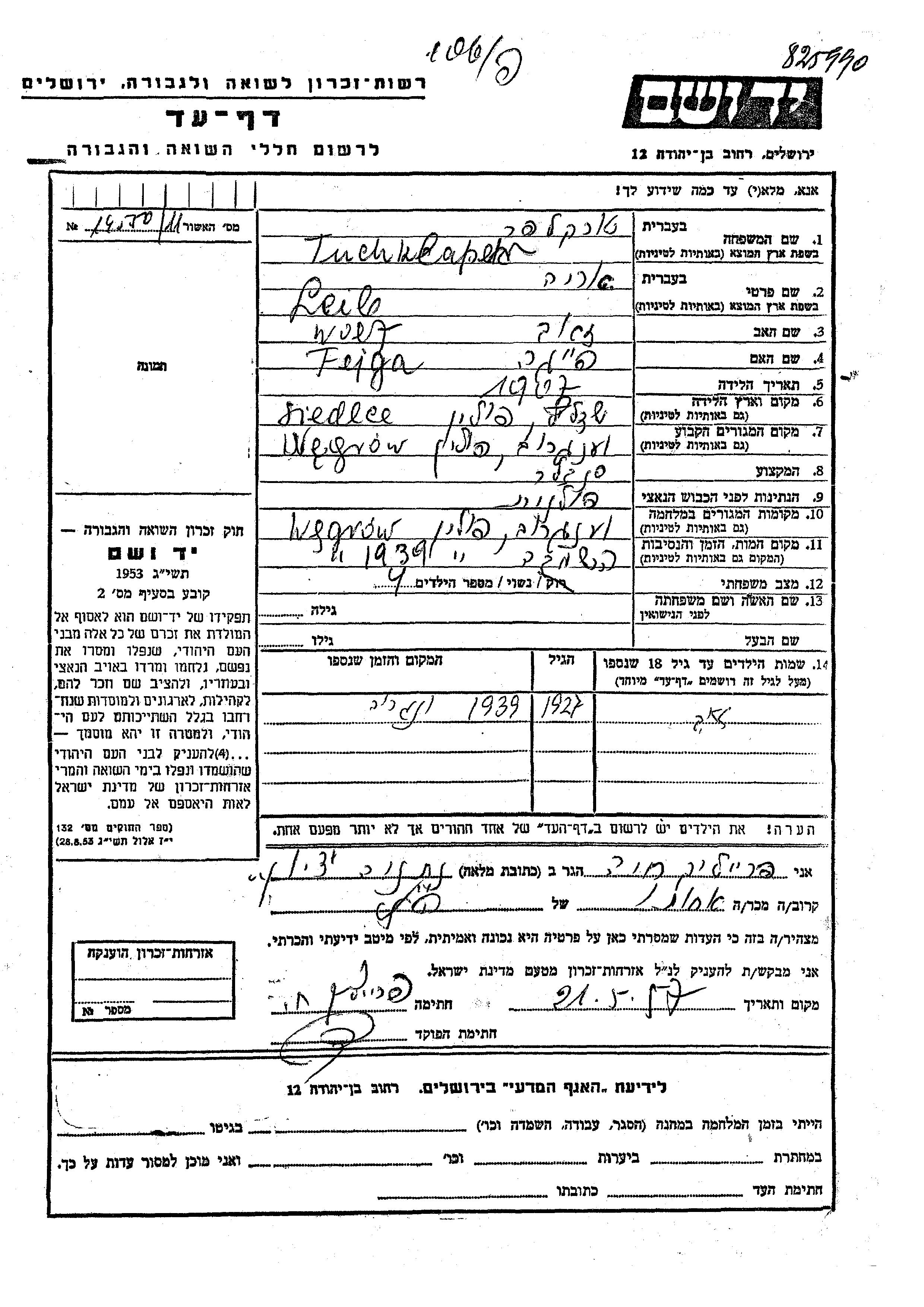 Тухклапер Лейб Арье 1907 Венгрув, Польша Лист свидетельских показаний