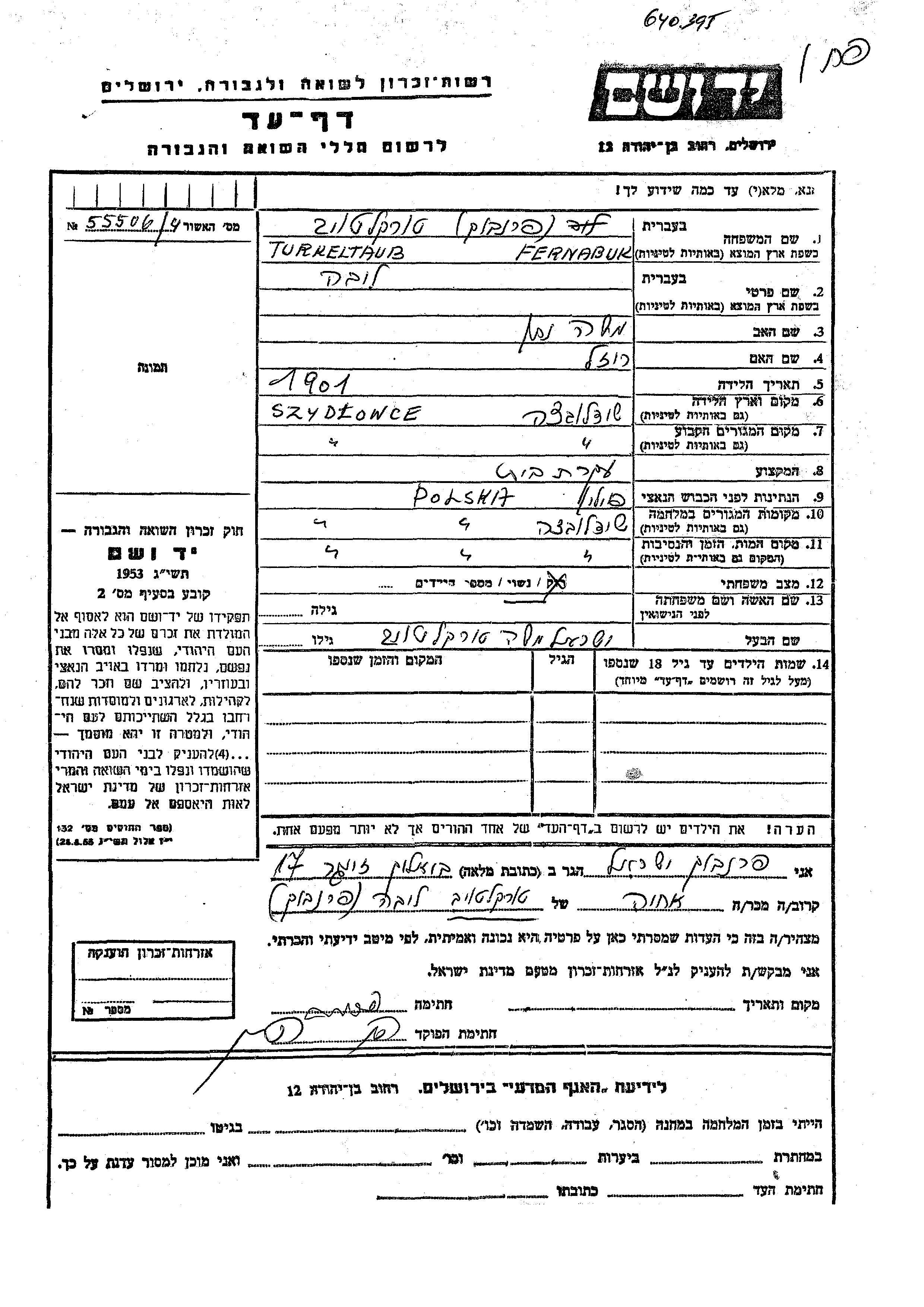 Люба Туркельтауб, девичья фамилия Фернабук Ферненбуг, место рождения: Шидловец, Польша. Отец: Моше Натан, mать:Рейзел. Домохозяйка. Женат / замужем. Место жительства до войны: Шидловец, Польша. Место во время войны: Шидловец, Польша.