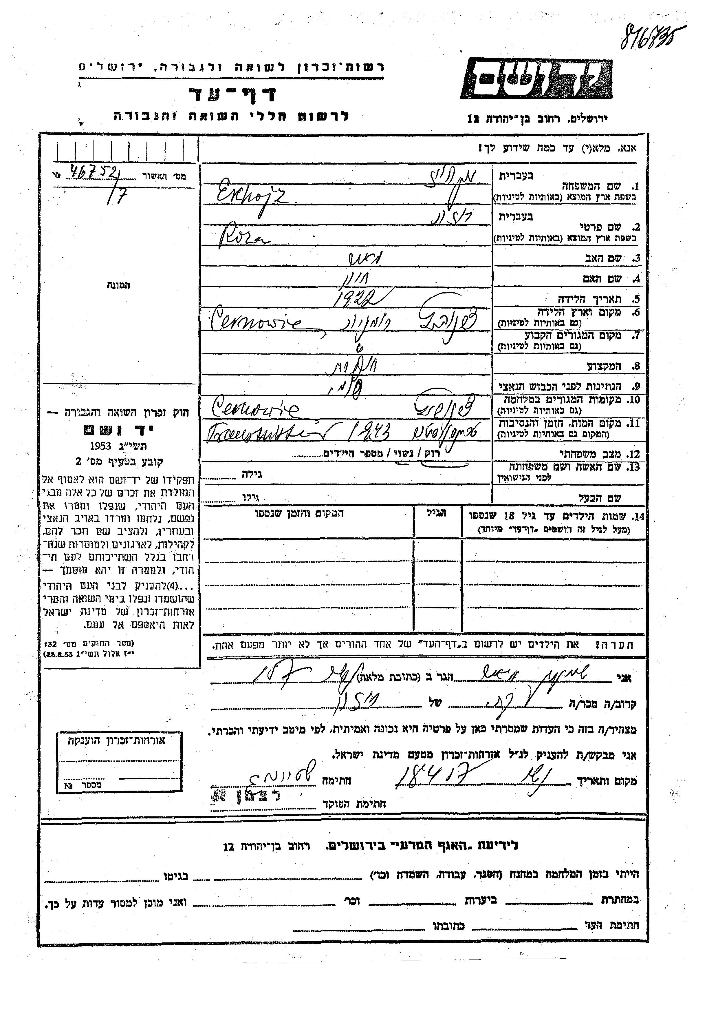 Роза Экхойз, место рождения: Черновцы, Румыния. Отец: Меир, mать:Хава. Швея. Холост / не замужем. Место жительства до войны: Черновцы, Румыния. Место во время войны: Черновцы, Румыния.