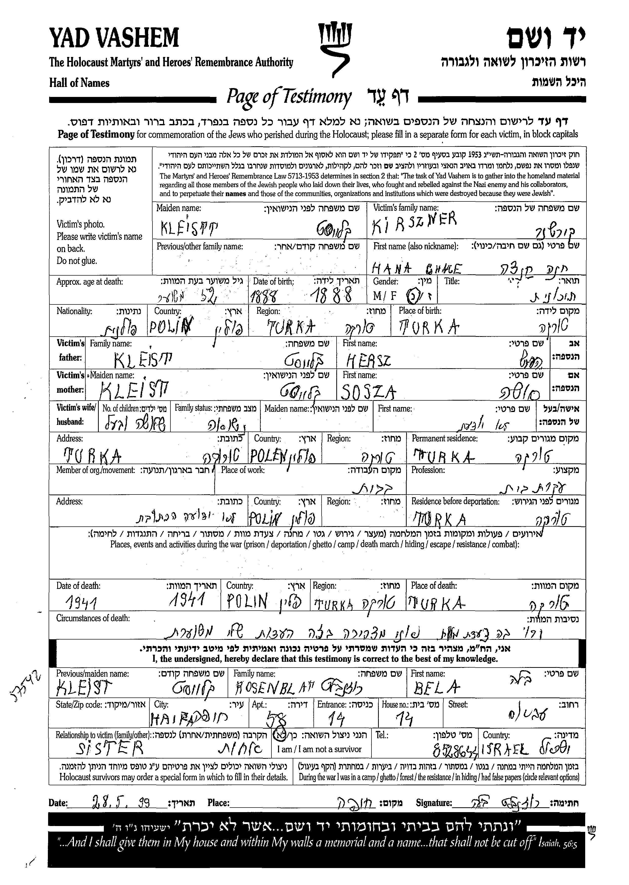 Хана Киршнер, девичья фамилия Клейст, место рождения: Турка, Польша. Отец: Герш, mать:Соша. Домохозяйка. Женат / замужем. Место жительства до войны: Турка, Польша. Место во время войны: Турка, Польша.