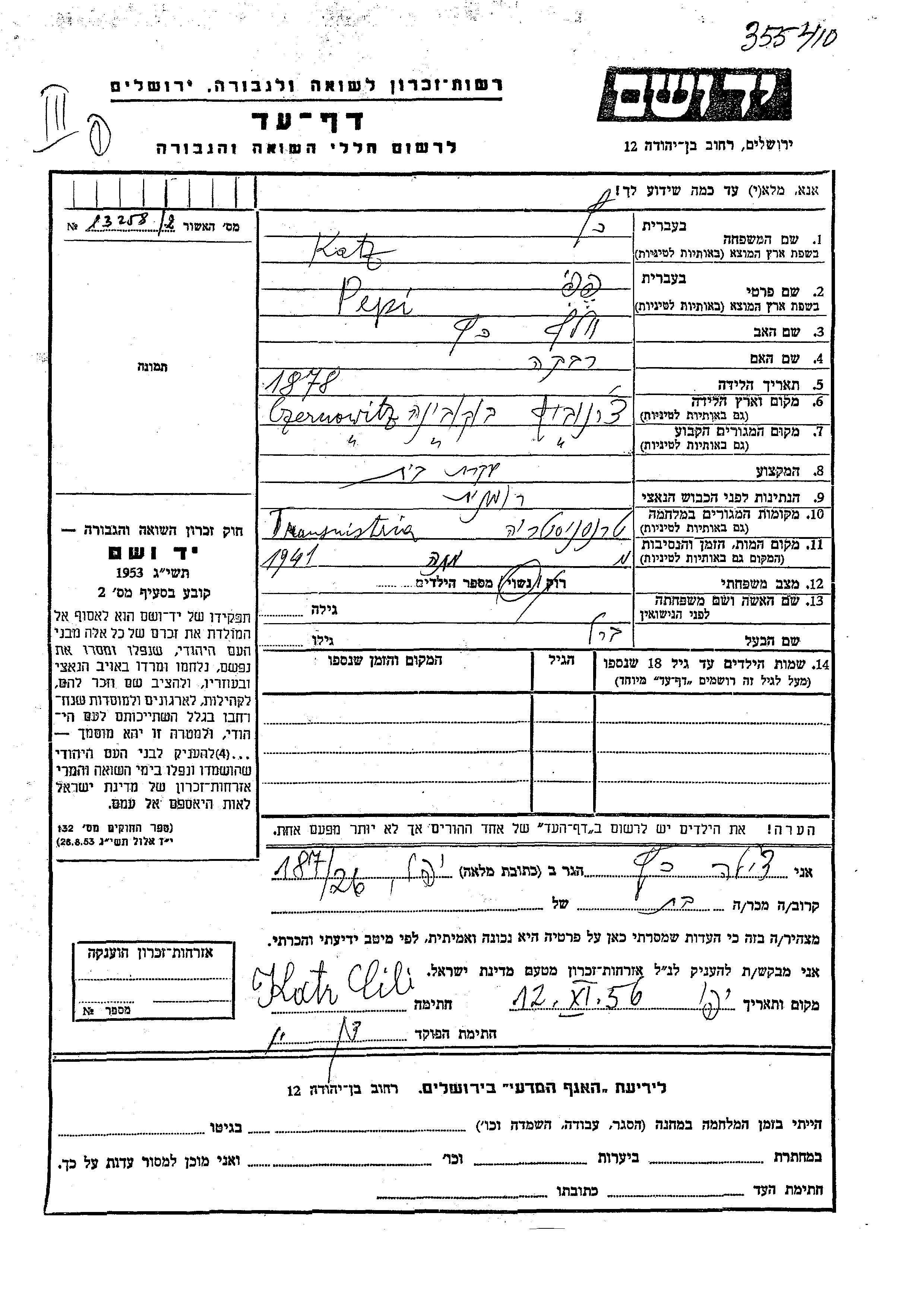 Пепи Кац, место рождения: Черновцы, Румыния. Отец: Вольф, mать:Ривка. Домохозяйка. Женат / замужем. Место жительства до войны: Черновцы, Румыния. Место во время войны: Транснистрия, Украина (СССР).
