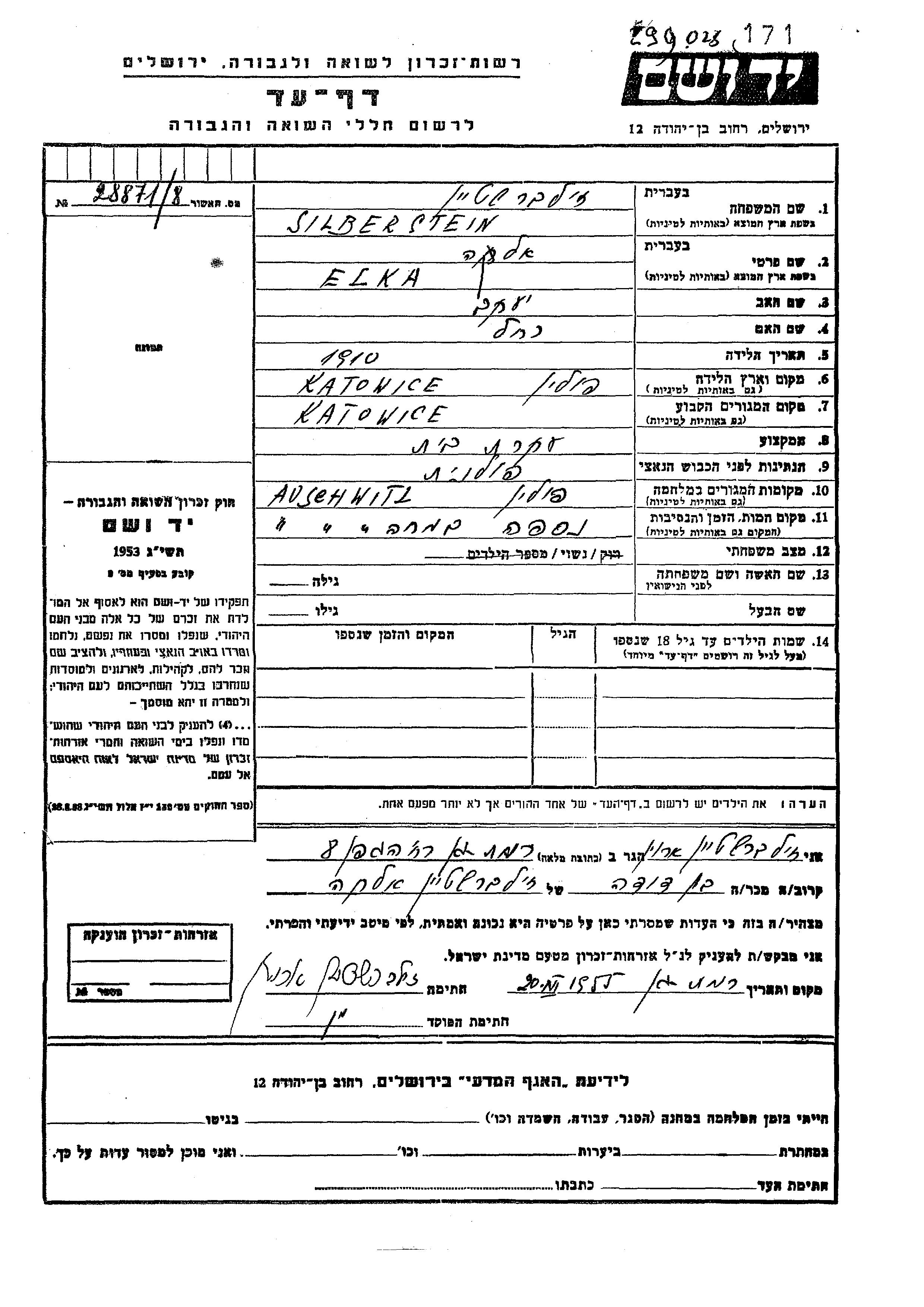 Элка Сильберштейн, место рождения: Катовице, Польша. Отец: Яков, mать:Рахель. Домохозяйка. Женат / замужем. Место жительства до войны: Катовице, Польша. Место во время войны: Аушвиц, Польша.