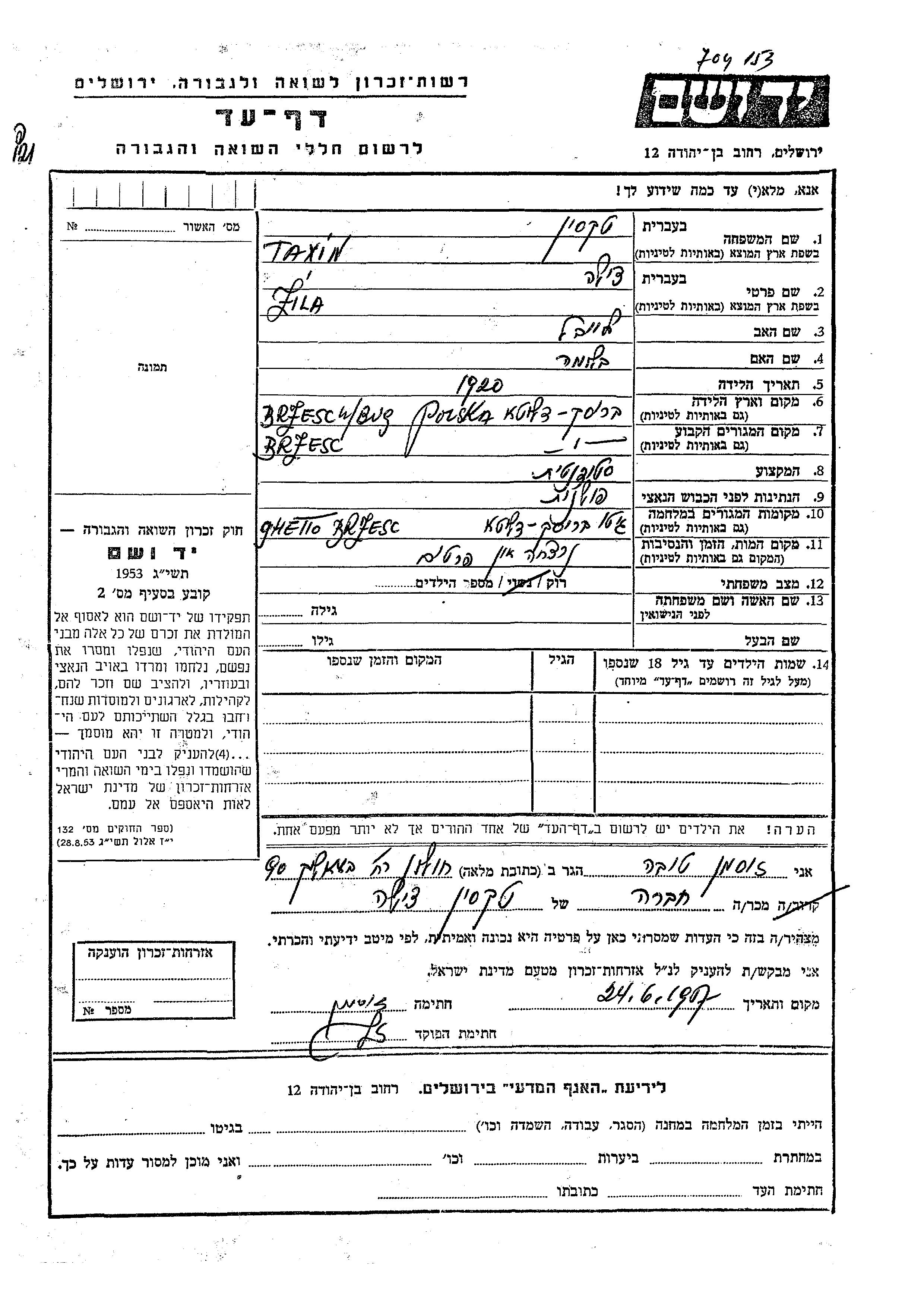Цила Таксин, место рождения: Брест Над Бугом, Польша. Отец: Лейбел, mать:Блюма. Студент / студентка. Холост / не замужем. Место жительства до войны: Брест, Польша. Место во время войны: Брест Над Бугом, Польша.
