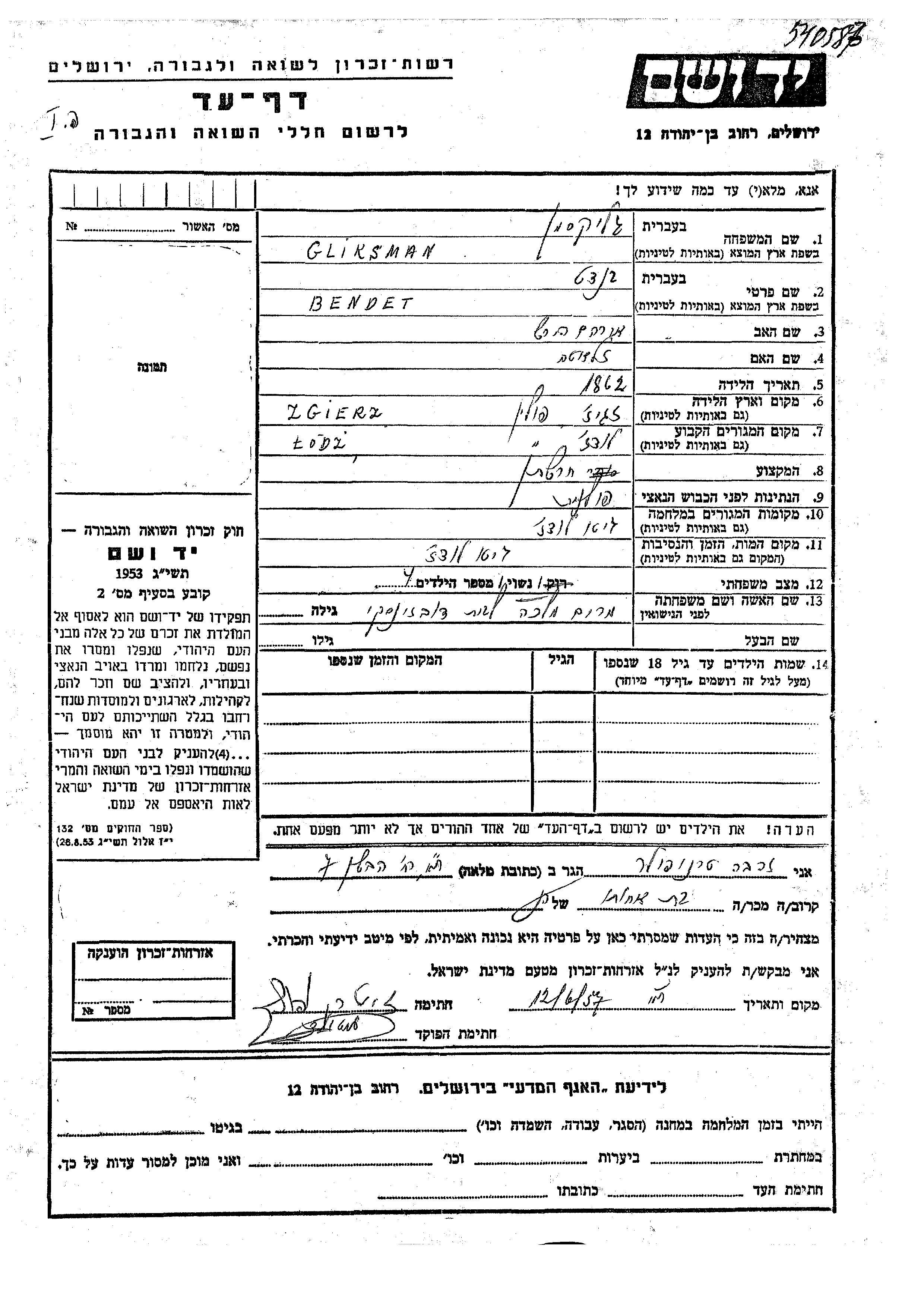 Бендет Гликсман, место рождения: Згеж, Польша. Отец: Авраам Хирш, mать:Злата. Фабрикант. Женат / замужем. Место жительства до войны: Лодзь, Польша. Место во время войны: Лодзь, Польша.