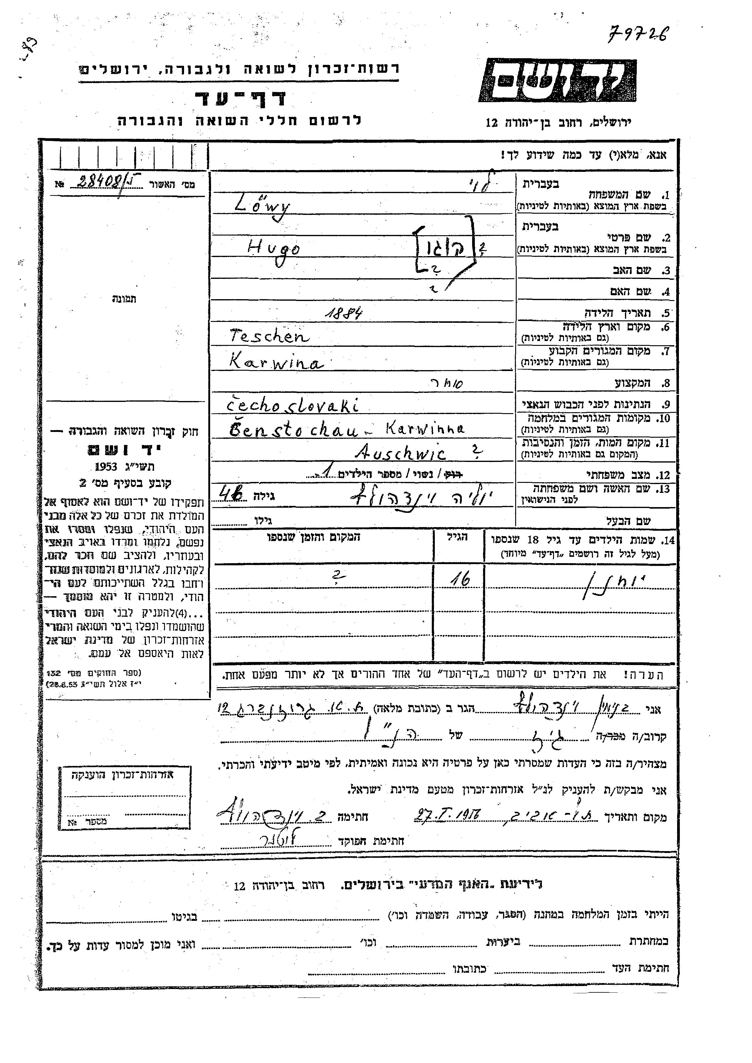 Лёви Хуго 1884 Карвина, Чехословакия Лист свидетельских показаний
