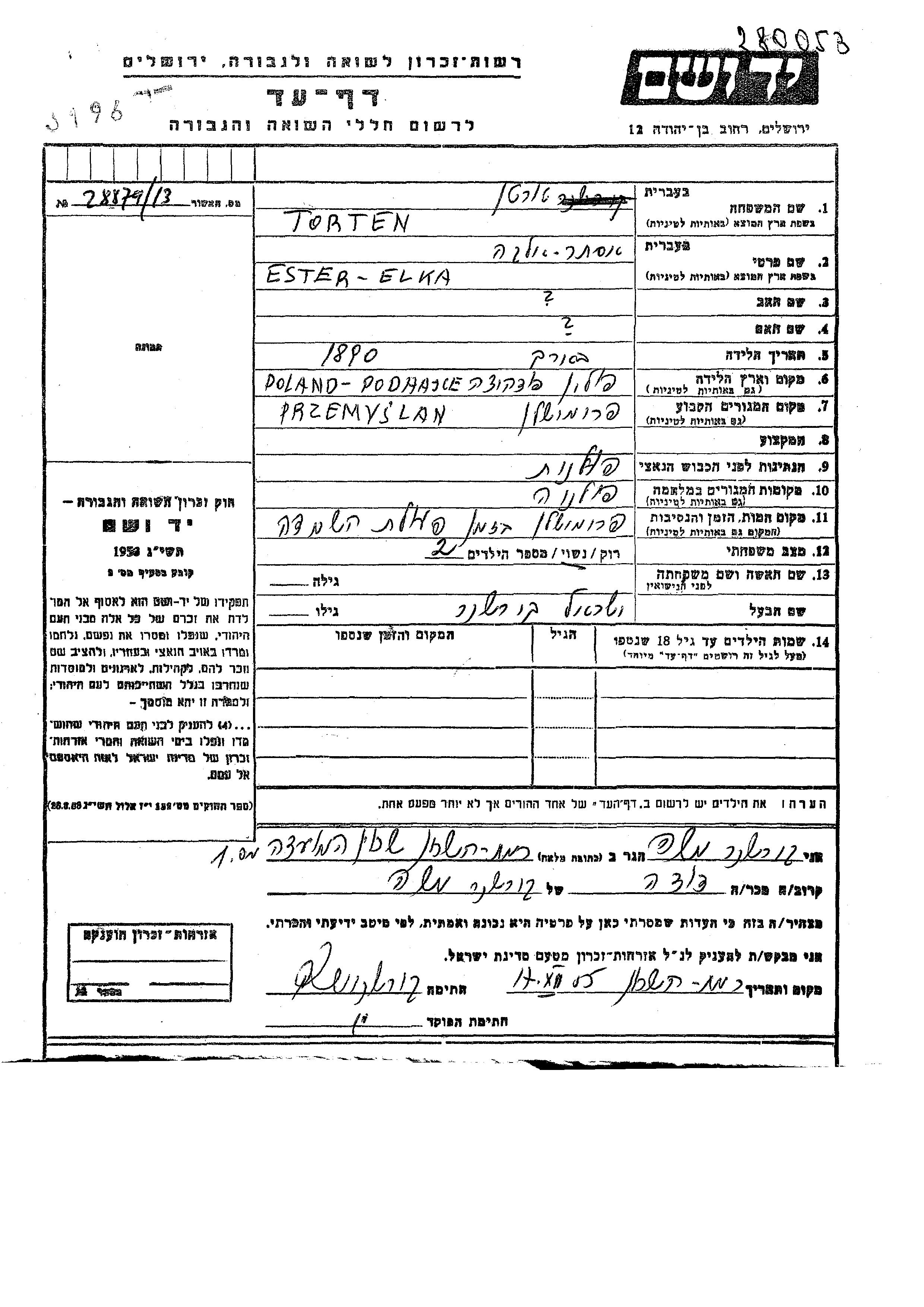 Элка Эстер Тортен Киршнер, девичья фамилия Тортен, место рождения: Подгайцы, Польша. Женат / замужем. Место жительства до войны: Перемышляны, Польша. Место во время войны: Польша.