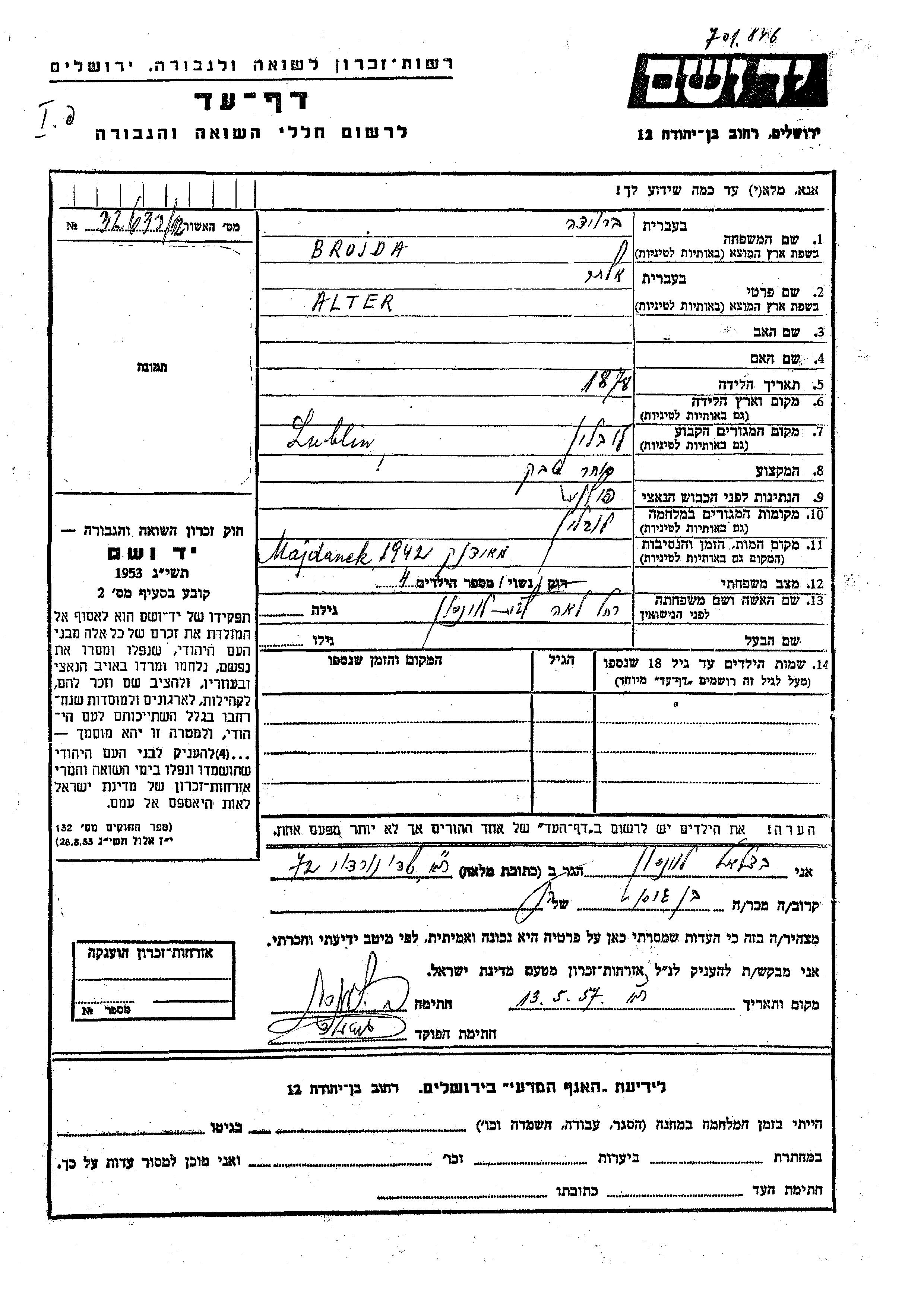 Алтер Бройда. Торговец табачными изделиями. Женат / замужем. Место жительства до войны: Люблин, Польша. Место во время войны: Люблин, Польша.