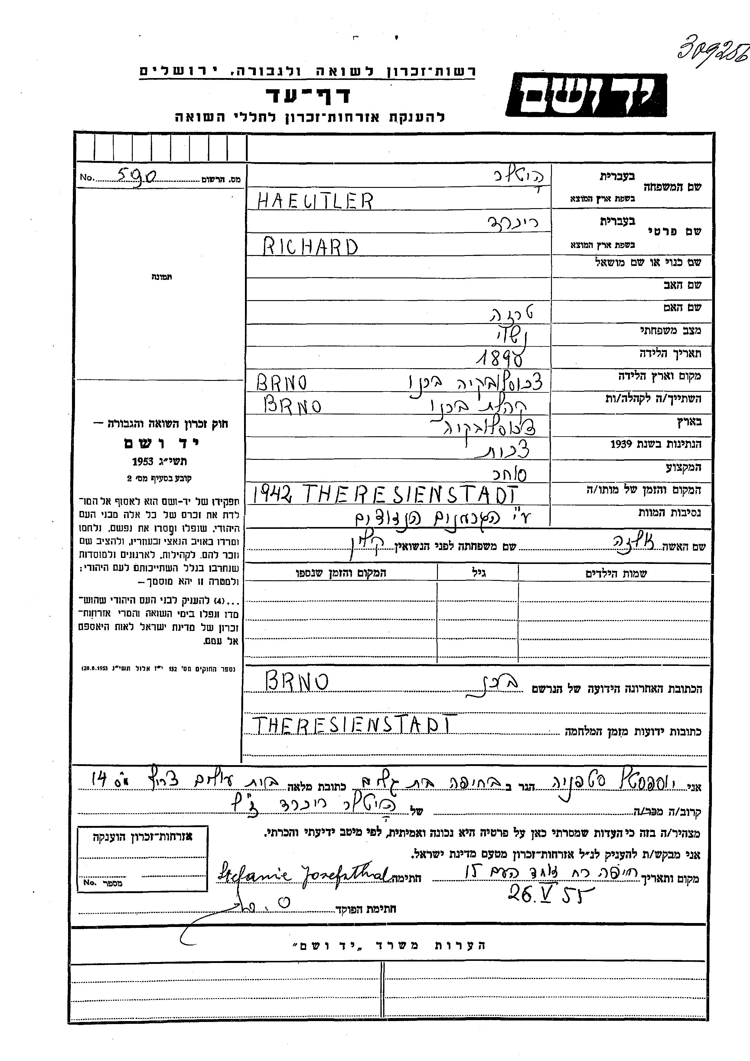 Рихард Хойтлер Хитлер, место рождения: Брно, Чехословакия.Mать:Тереза. Торговец / торговка. Место жительства до войны: Чехословакия. Место во время войны: Терезиенштадт, Чехословакия.