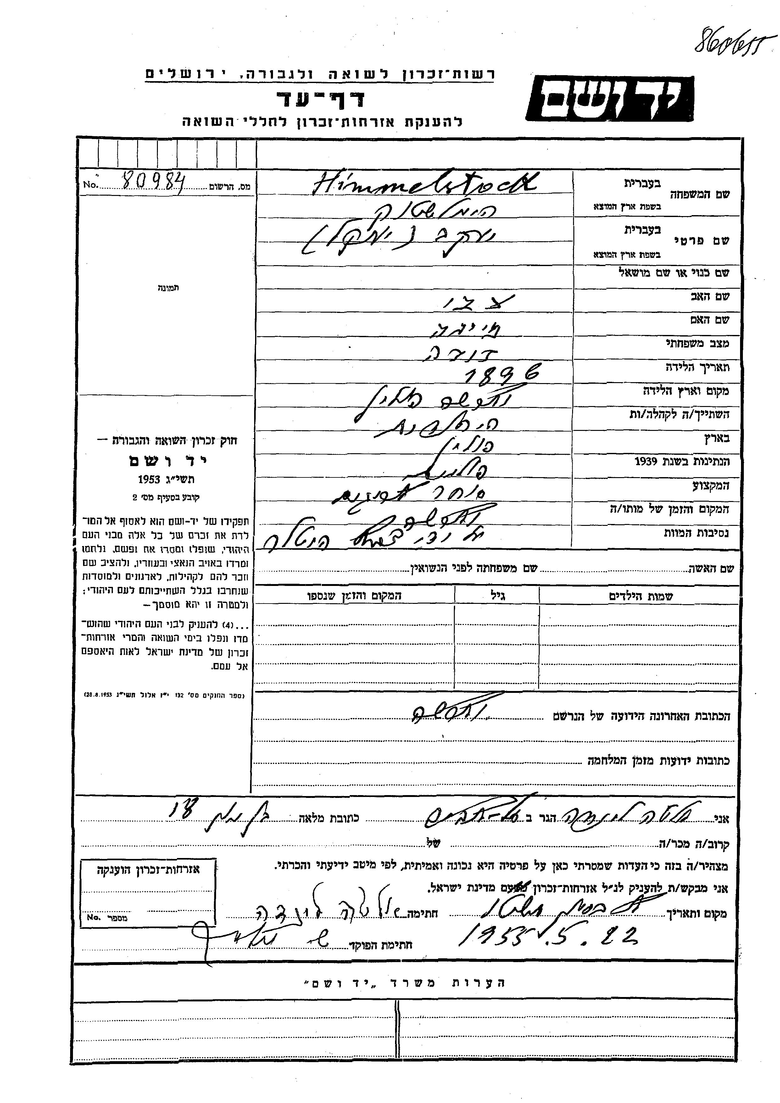 Яков Химмельшток, место рождения: Варшава, Польша. Отец: Цви, mать:Фейга. Торговец текстилем. Место во время войны: Варшава, Польша.