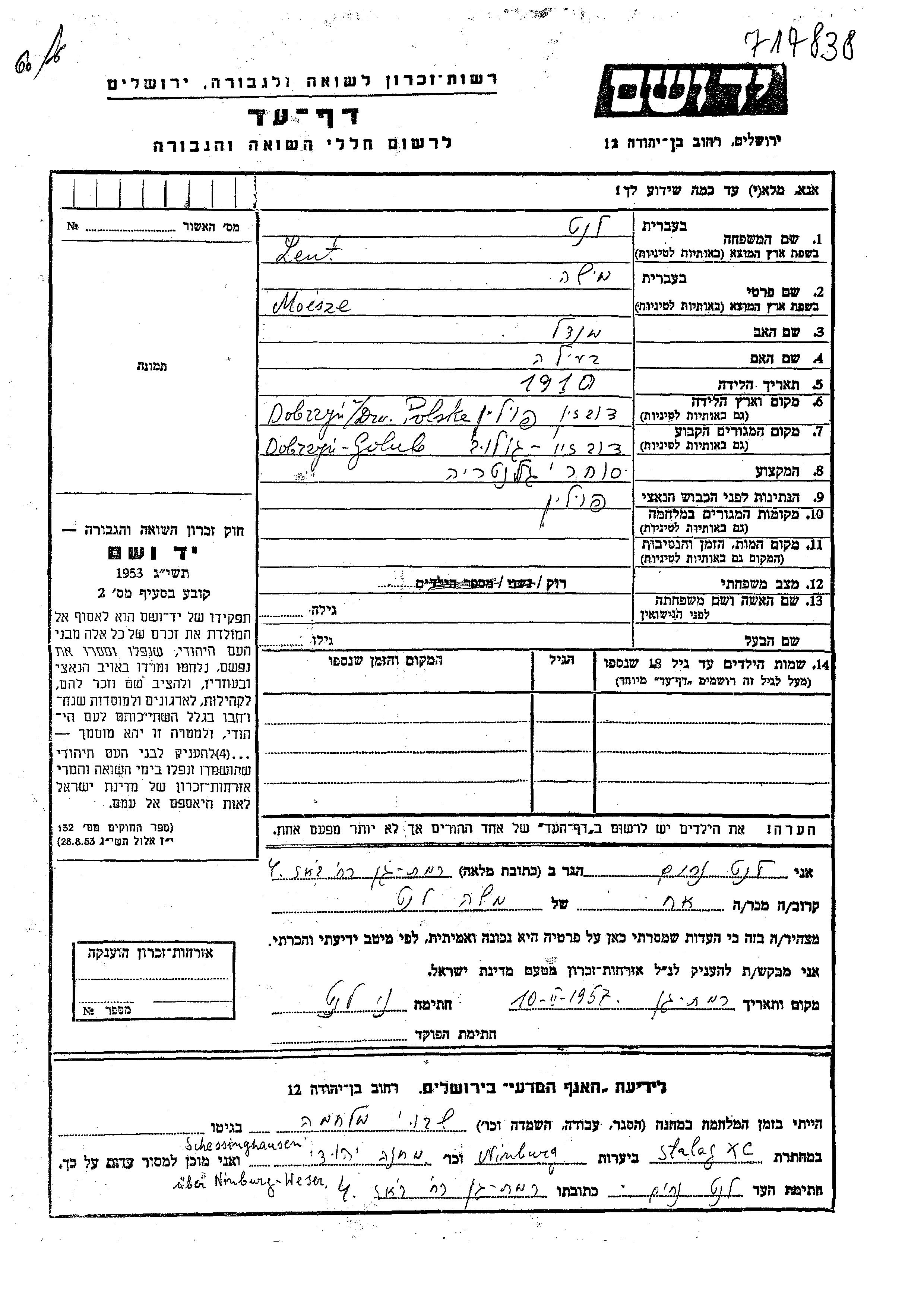 Лент Мойше Миша 1910 Голуб-Добжинь, Польша Лист свидетельских показаний