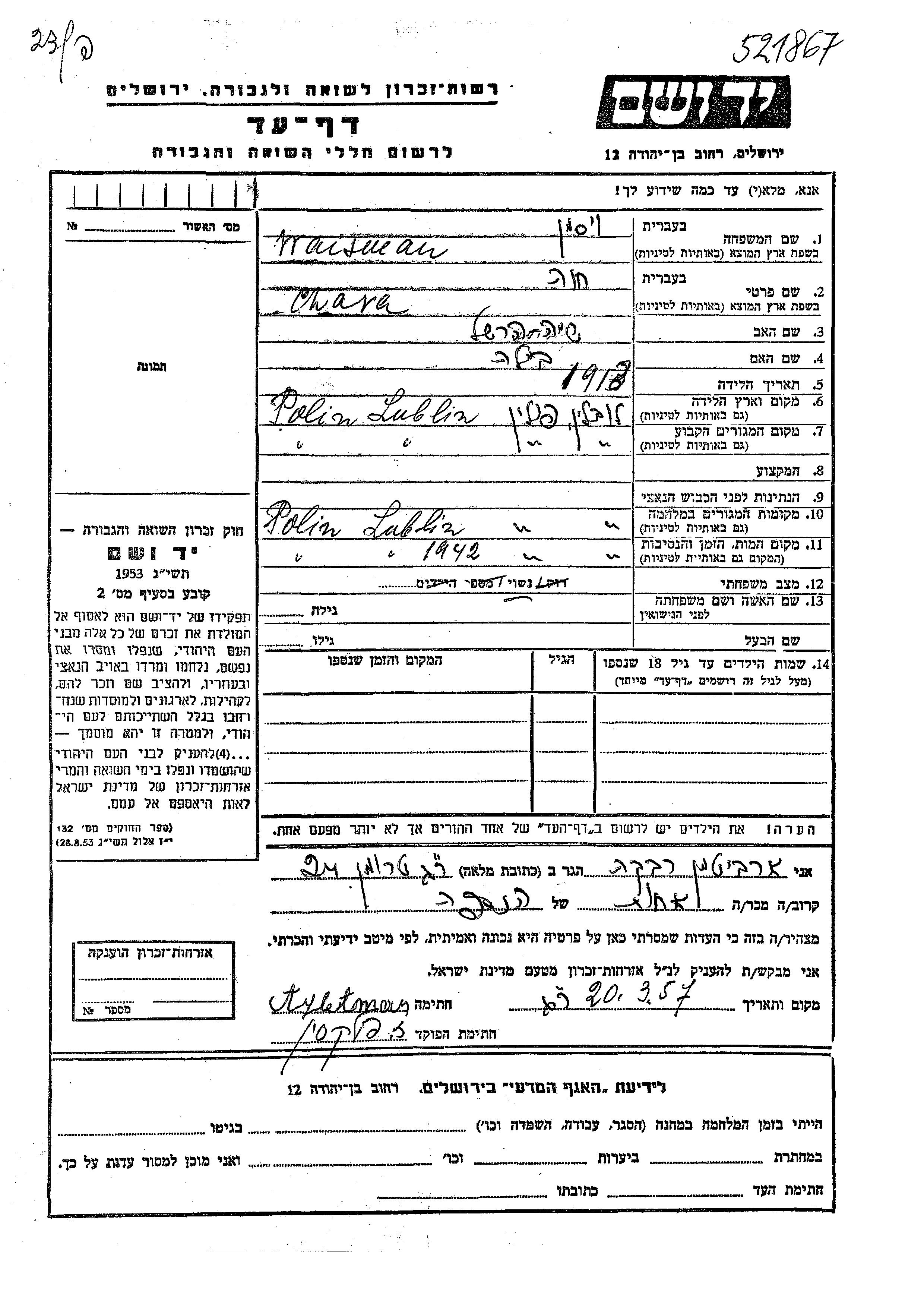 Вайсман Хава 1913 Люблин, Польша Лист свидетельских показаний