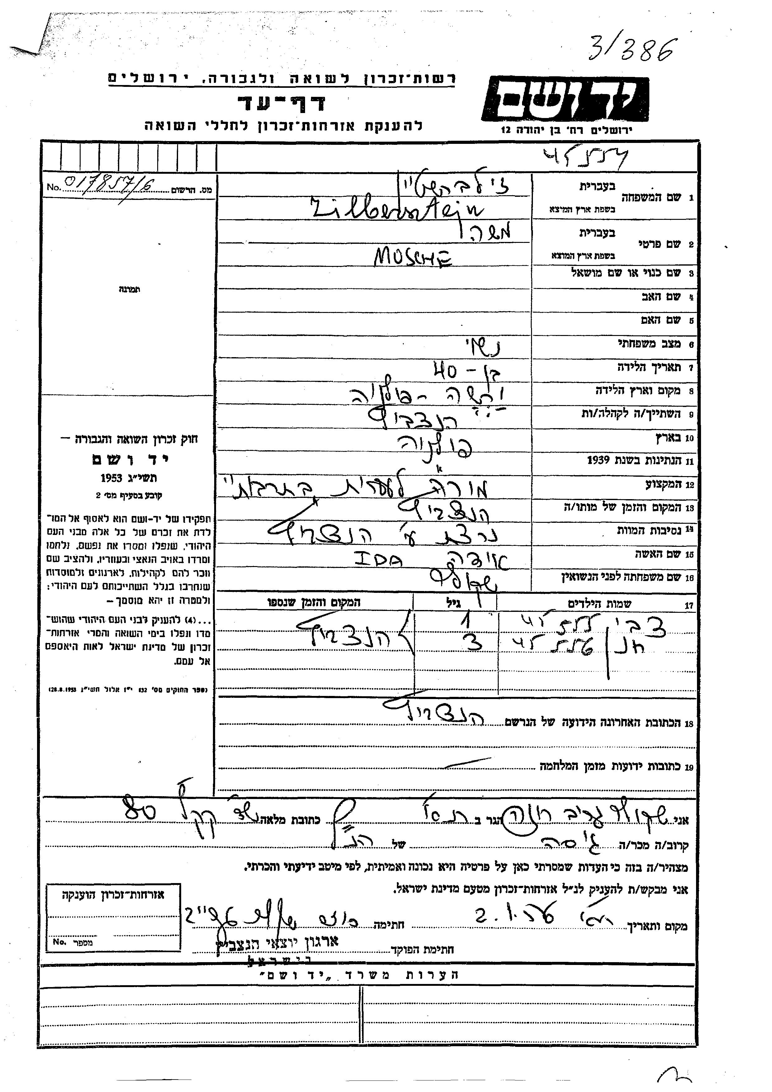 Моше Зильберштейн, место рождения: Варшава, Польша. Учитель / учительница. Женат / замужем. Место жительства до войны: Ганцевичи, Польша. Место во время войны: Ганцевичи, Польша.
