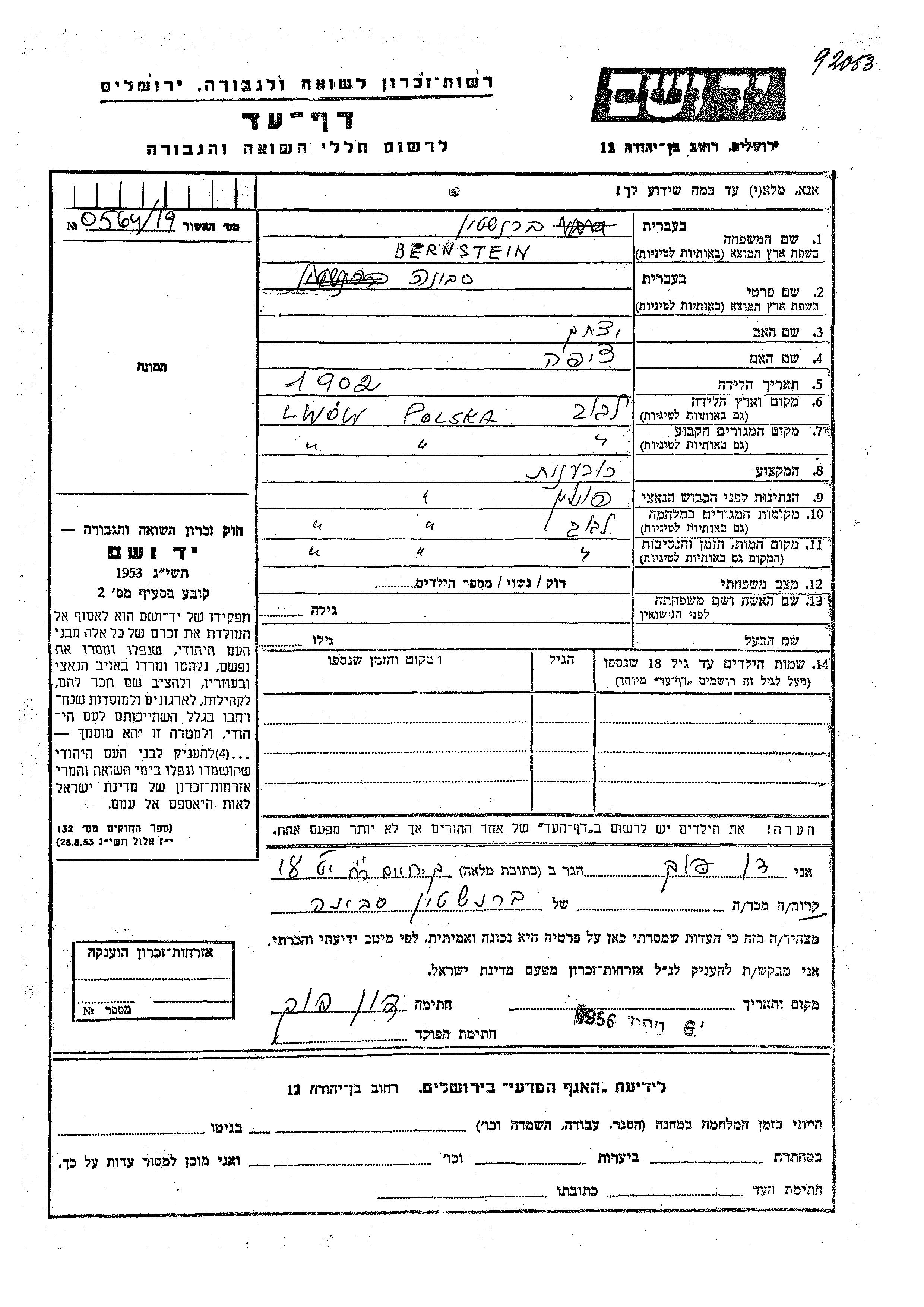 Бернштайн Сабина 1902 Львов, Польша Лист свидетельских показаний