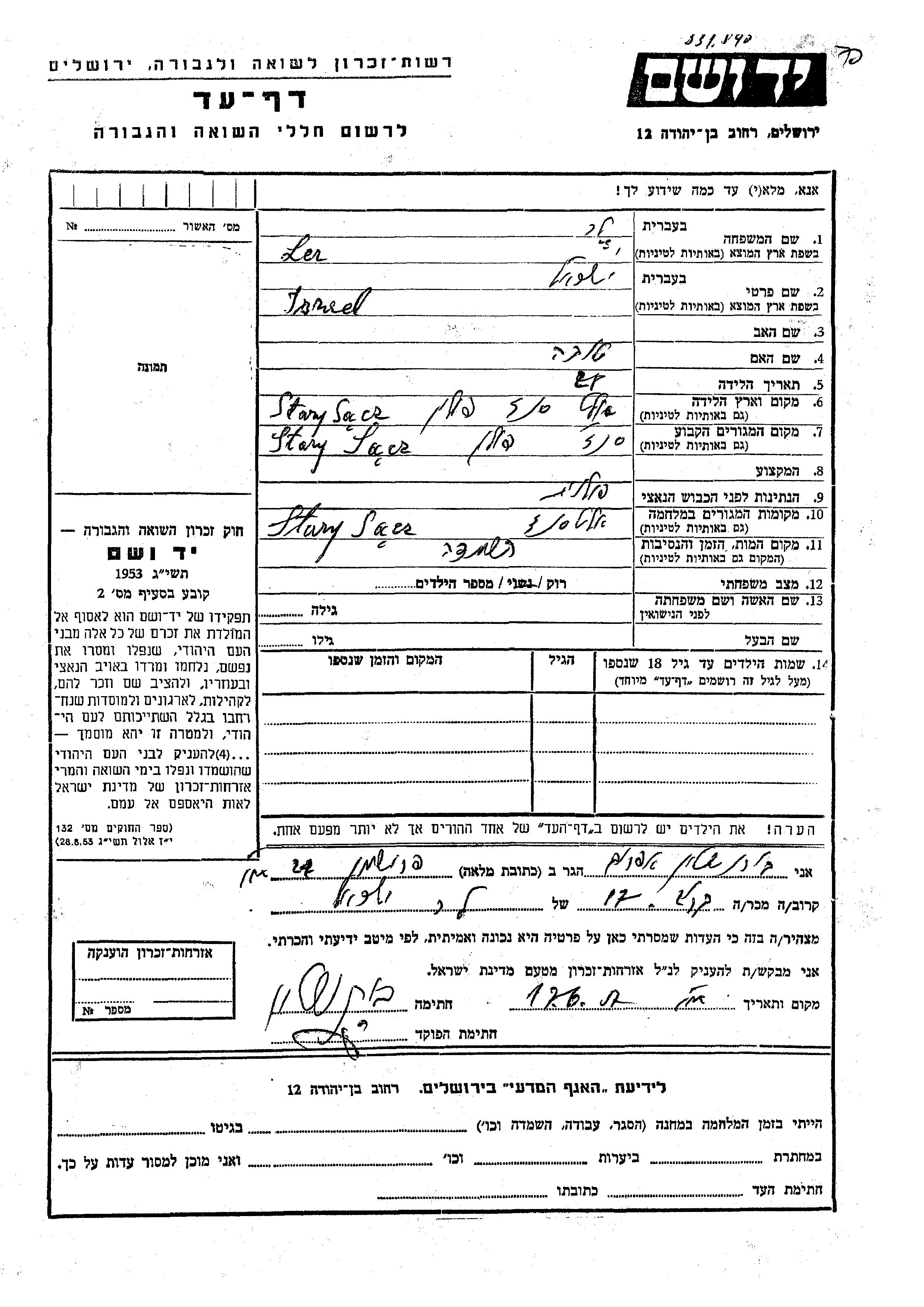 Исраэль Лер, место рождения: Стары-Сонч, Польша.Mать:Това. Женат / замужем. Место жительства до войны: Стары-Сонч, Польша. Место во время войны: Стары-Сонч, Польша.