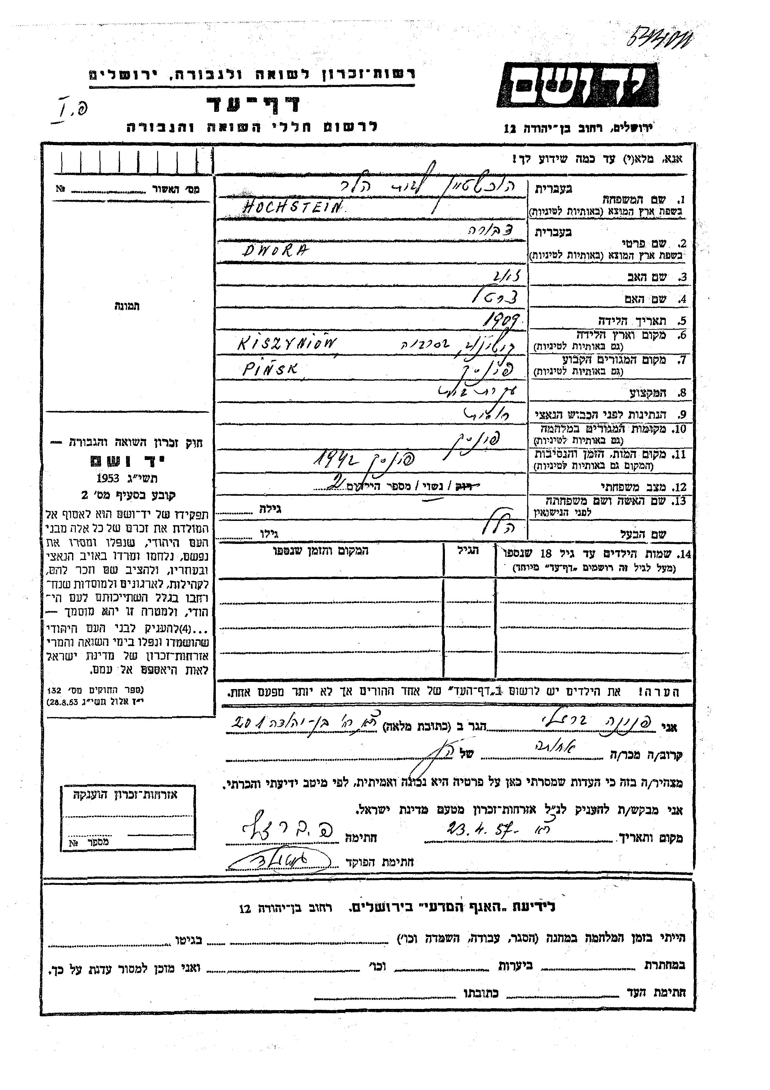 Двора Хохштайн, девичья фамилия Хелер, место рождения: Кишинёв, Румыния. Отец: Зеев, mать:Цартл. Домохозяйка. Женат / замужем. Место жительства до войны: Пинск, Польша. Место во время войны: Пинск, Польша.
