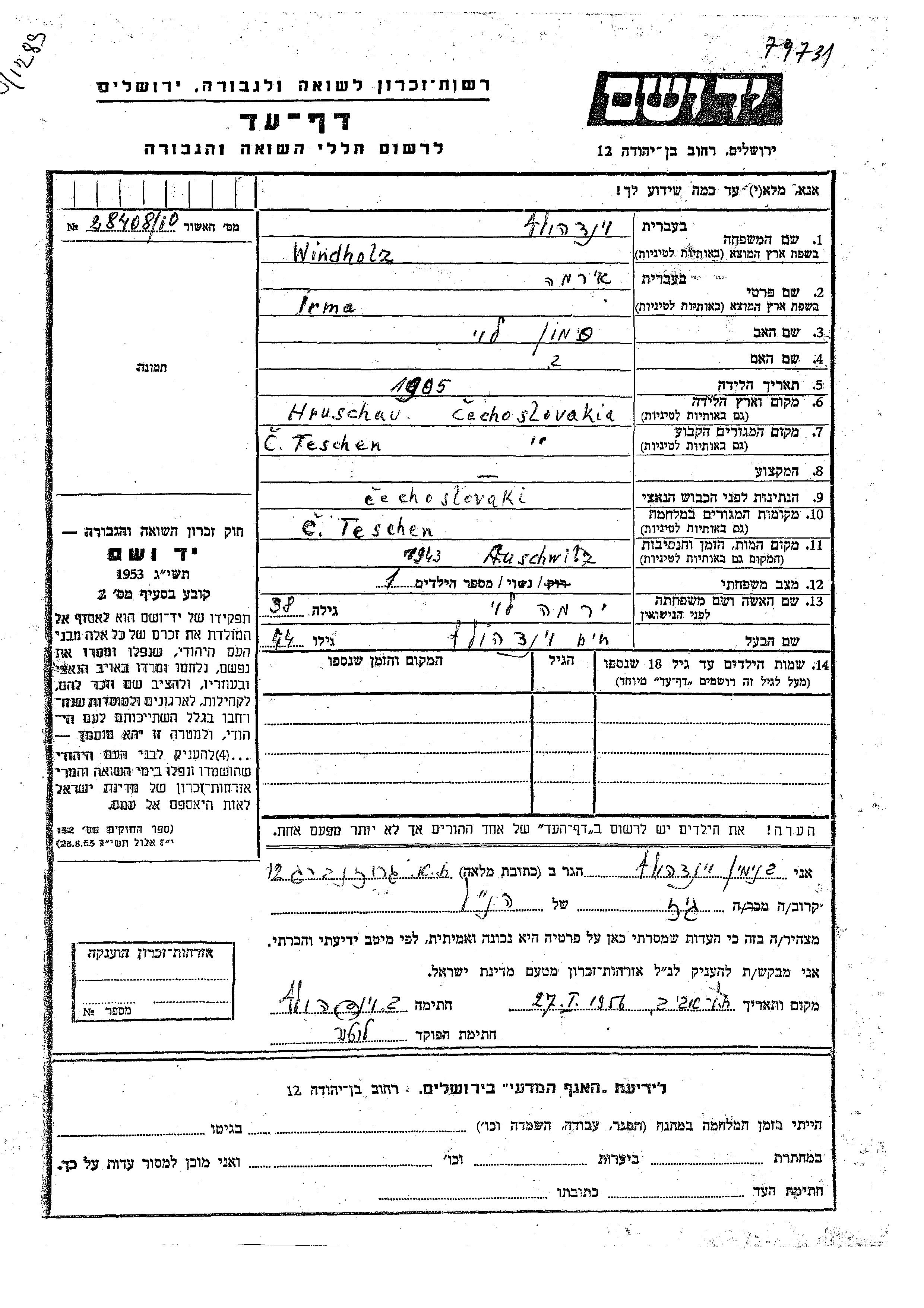 Ирма Виндхольц, девичья фамилия Леви, место рождения: Хрушау, Чехословакия. Отец: Симон. Женат / замужем. Место жительства до войны: Тешин, Чехословакия. Место во время войны: Тешин, Чехословакия.