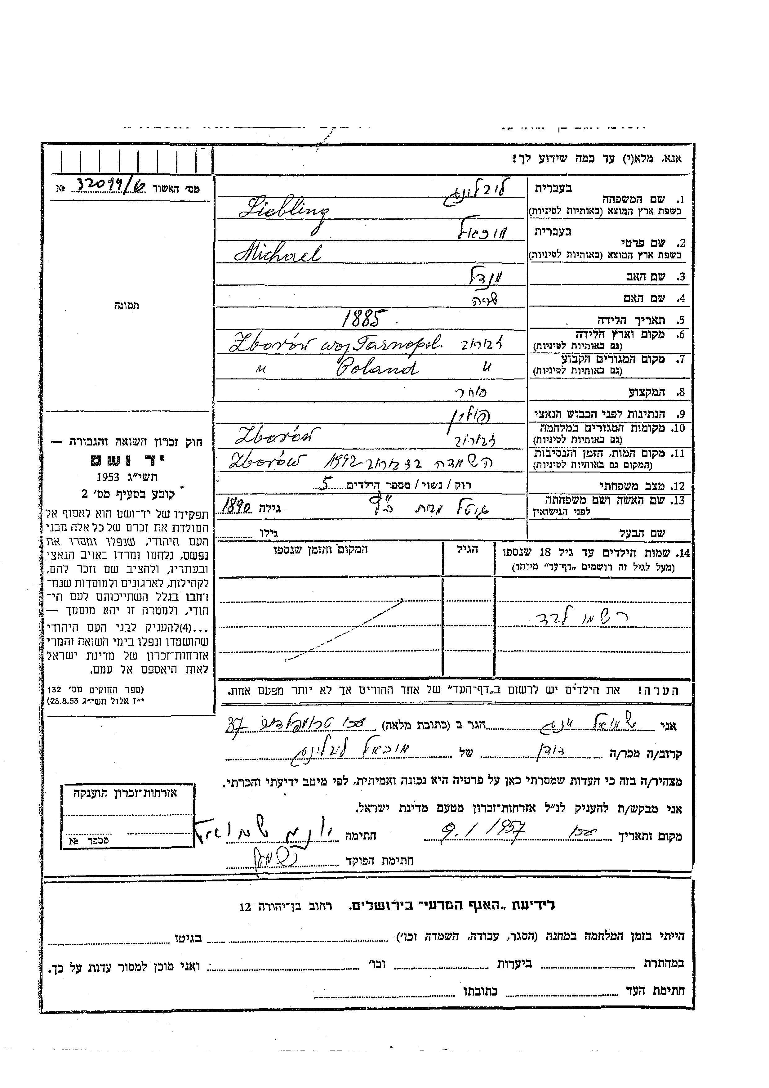 Либлинг Люблинг Михаэль 1885 Зборов, Польша Лист свидетельских показаний