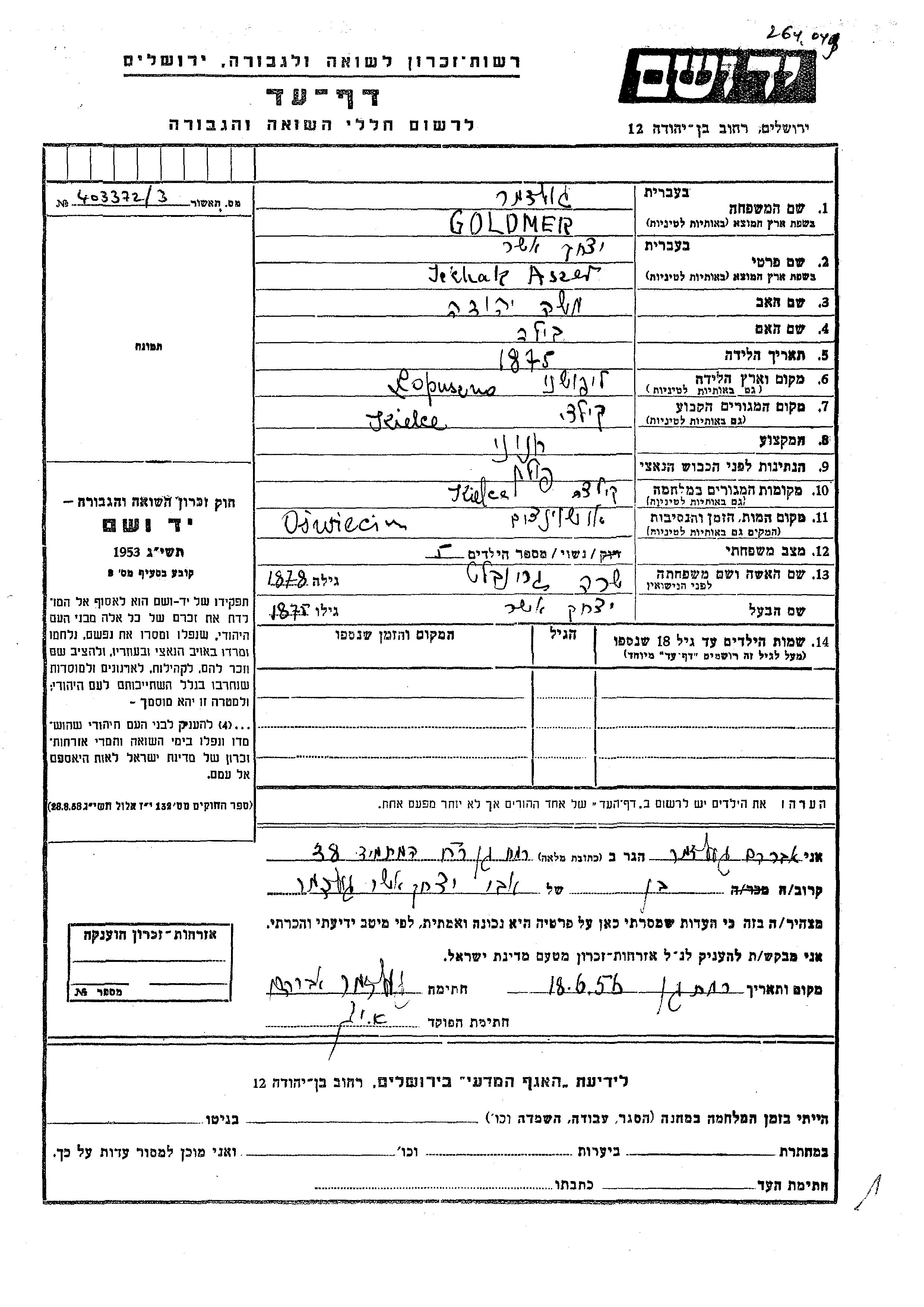 Ицхак Ашер Гольдмер, место рождения: Лопушно, Польша. Отец: Моше Иегуда, mать:Била. Бакалейщик / бакалейщица. Женат / замужем. Место жительства до войны: Кельце, Польша. Место во время войны: Кельце, Польша.