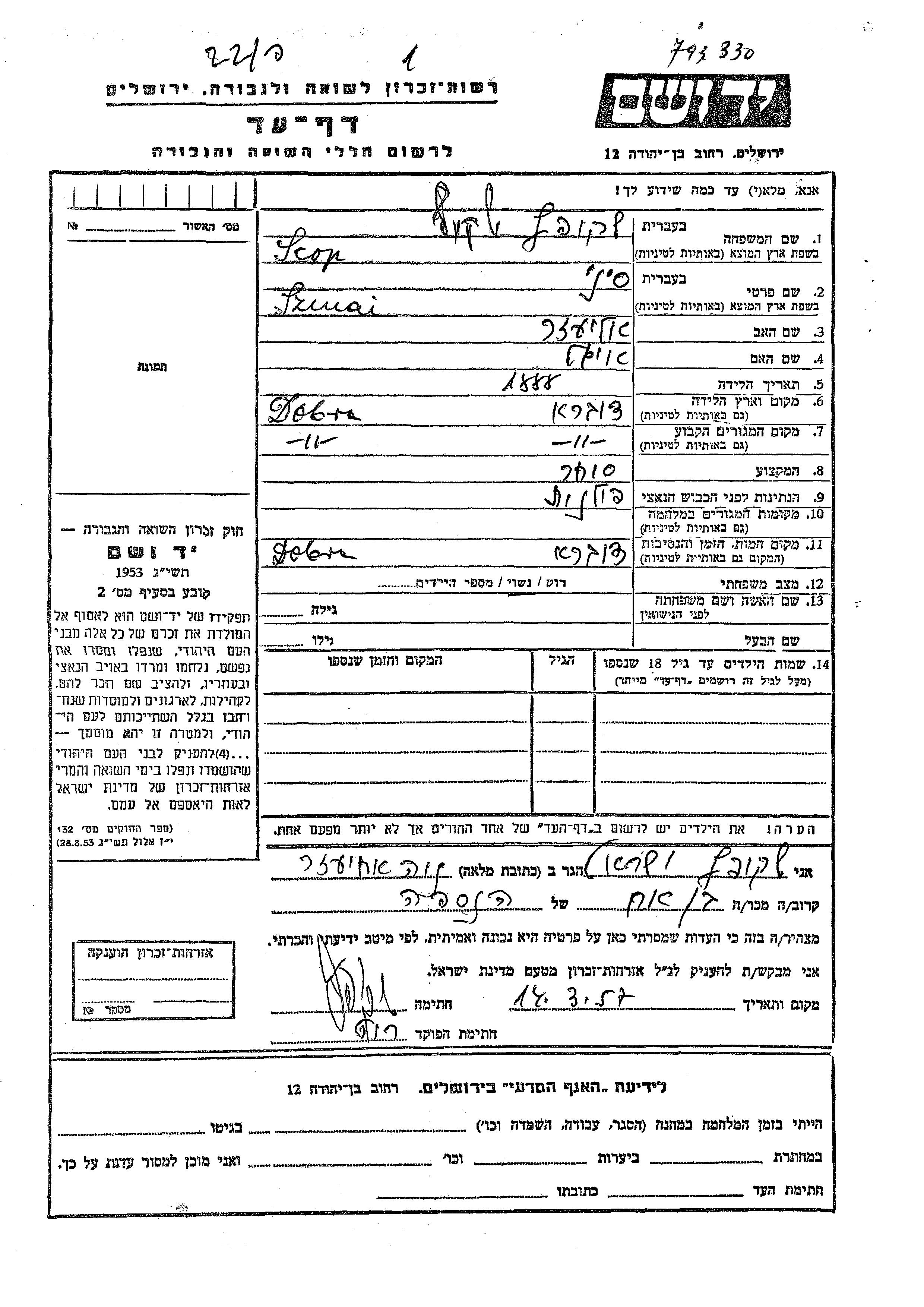 Яд Вашем - Листы свидетельских показаний Мемориального фонда