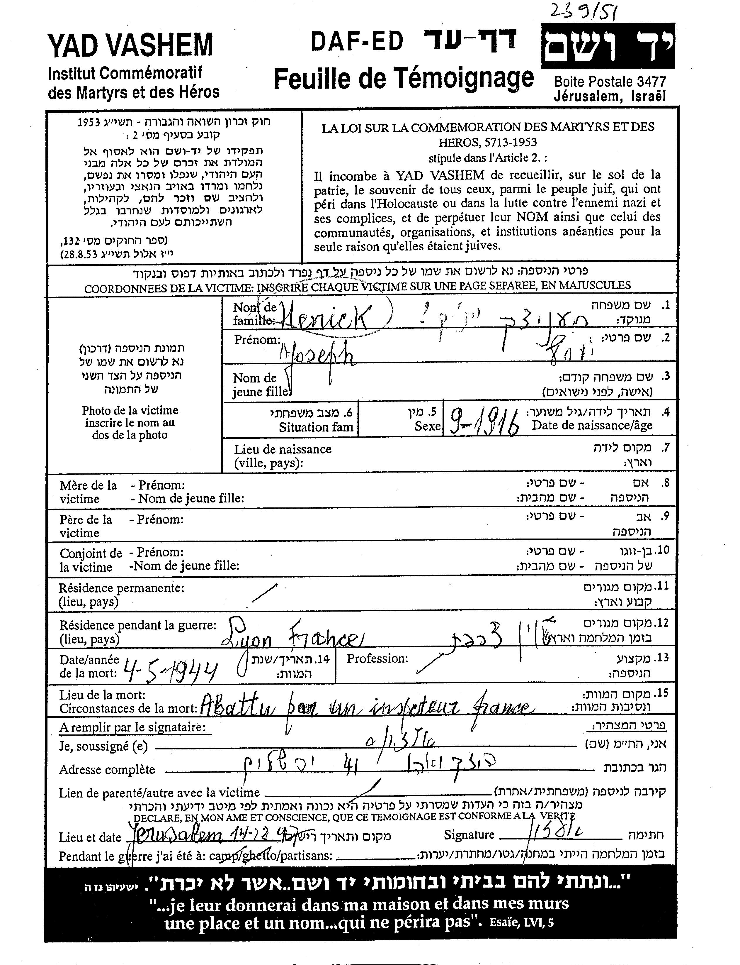 Йосеф уничтожен в период Шоа. место смерти: Лион, Франция в 1944.