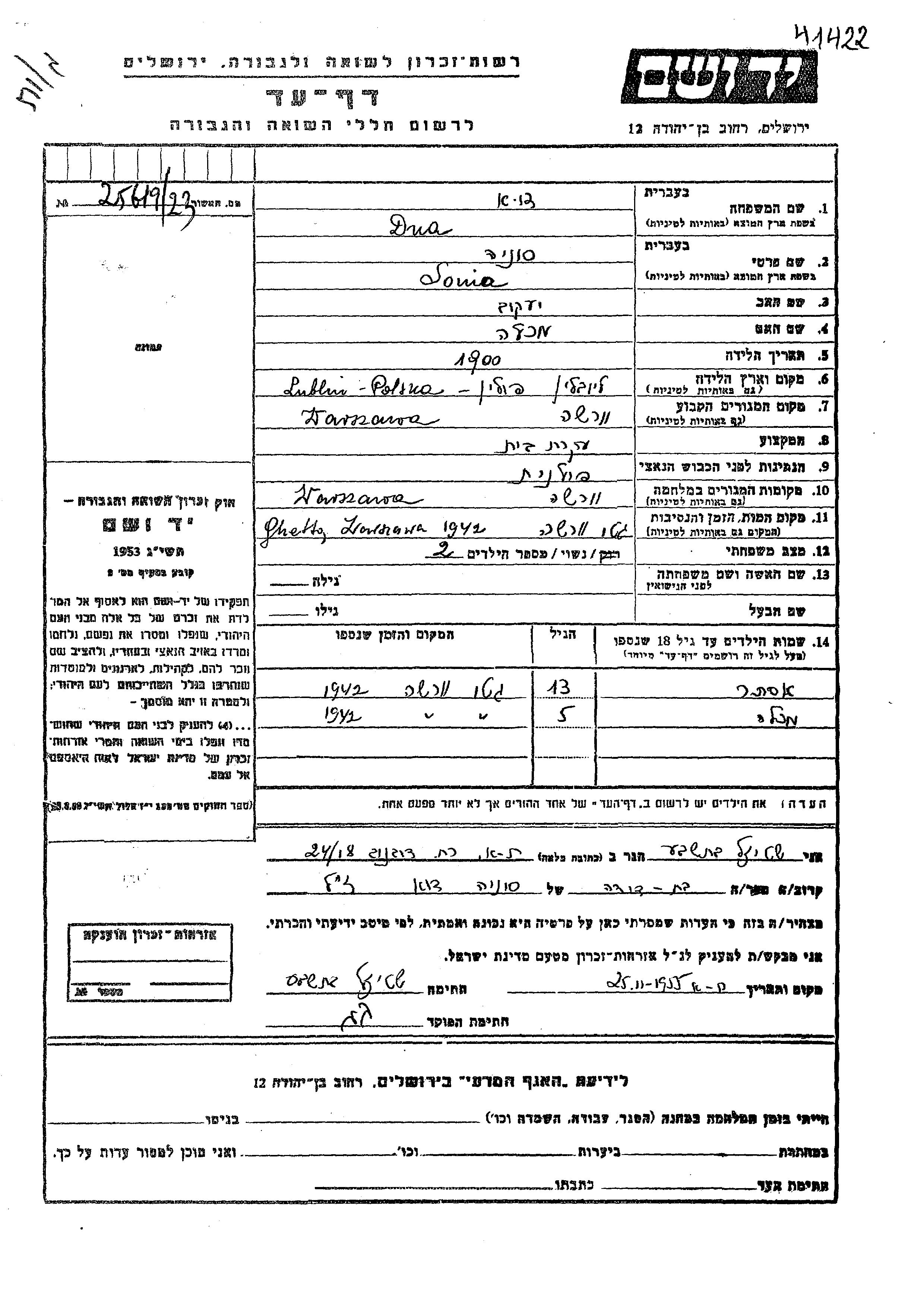 Соня Дуа, место рождения: Люблин, Польша. Отец: Яков, mать:Мерале. Домохозяйка. Женат / замужем. Место жительства до войны: Варшава, Польша. Место во время войны: Варшава, Польша.