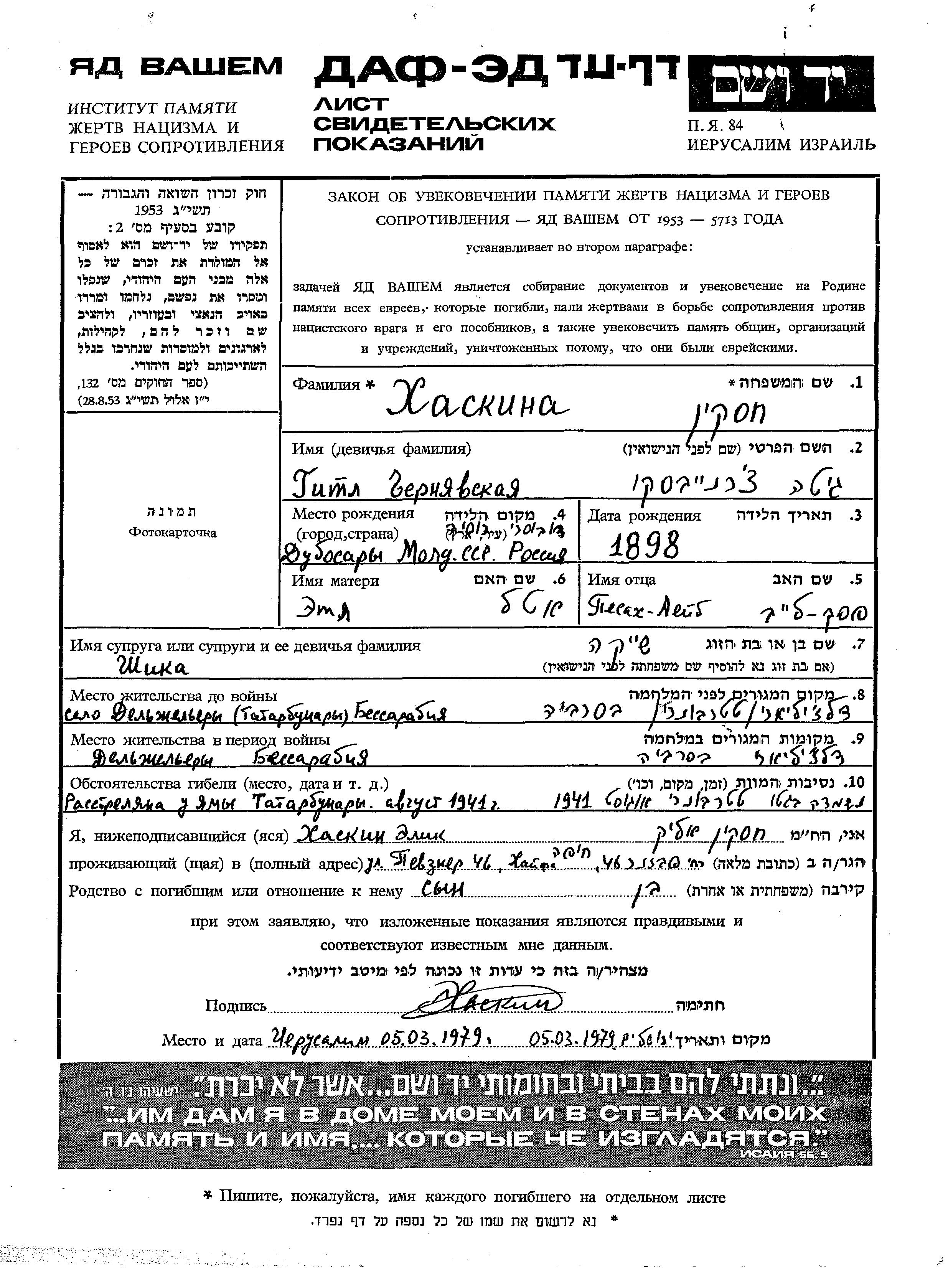 Гитл Хаскин, девичья фамилия Чернявский, место рождения: Дубоссары, Украина (СССР). Отец: Лейб Песах, mать:Этл. Женат / замужем. Место жительства до войны: Дельжилер, Румыния. Место во время войны: Дельжилер, Румыния.