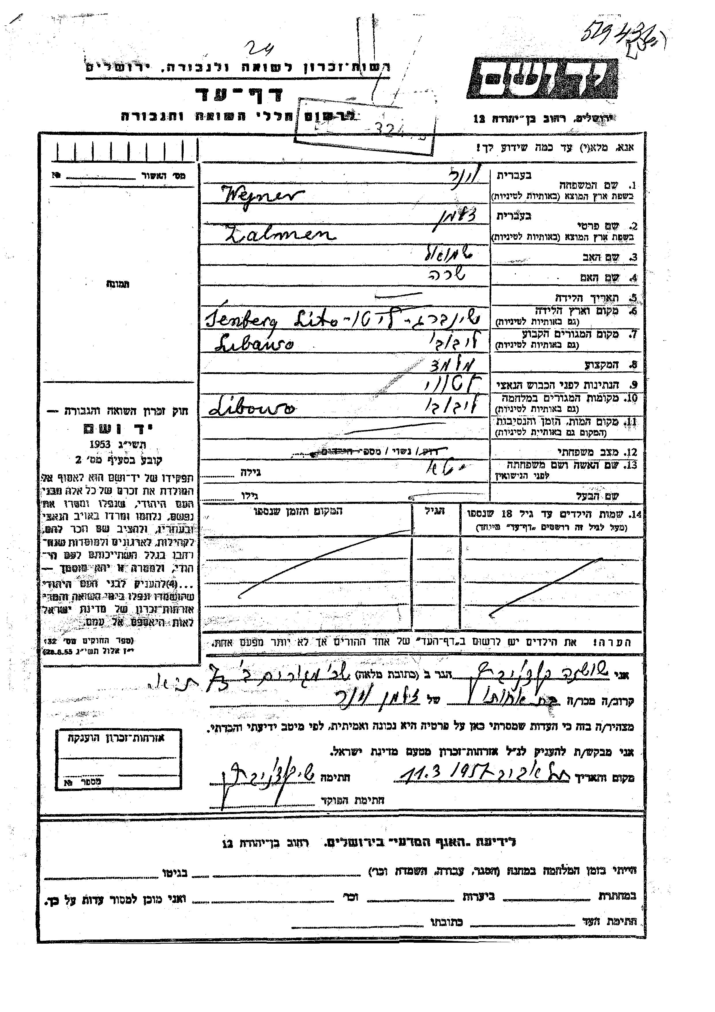 Залмен Вейнер Винер, место рождения: Шенберг, Латвия. Отец: Шмуэль, mать:Сара. Меламед. Женат / замужем. Место жительства до войны: Либава, Латвия. Место во время войны: Либава, Латвия.