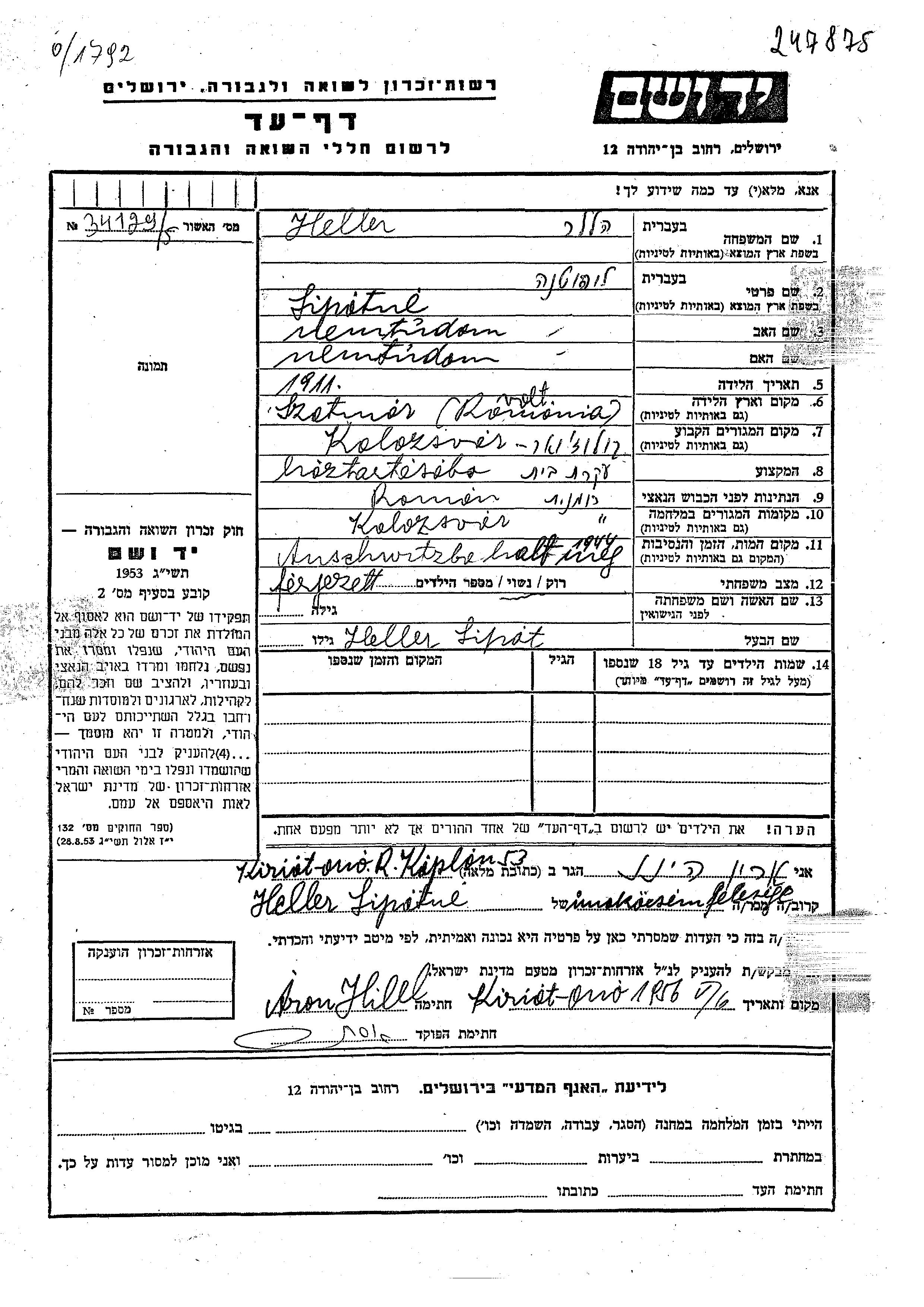 Имя неизвестно Хеллер, место рождения: Сатмарнемети, Румыния. Домохозяйка. Женат / замужем. Место жительства до войны: Коложвар, Румыния. Место во время войны: Коложвар, Румыния.