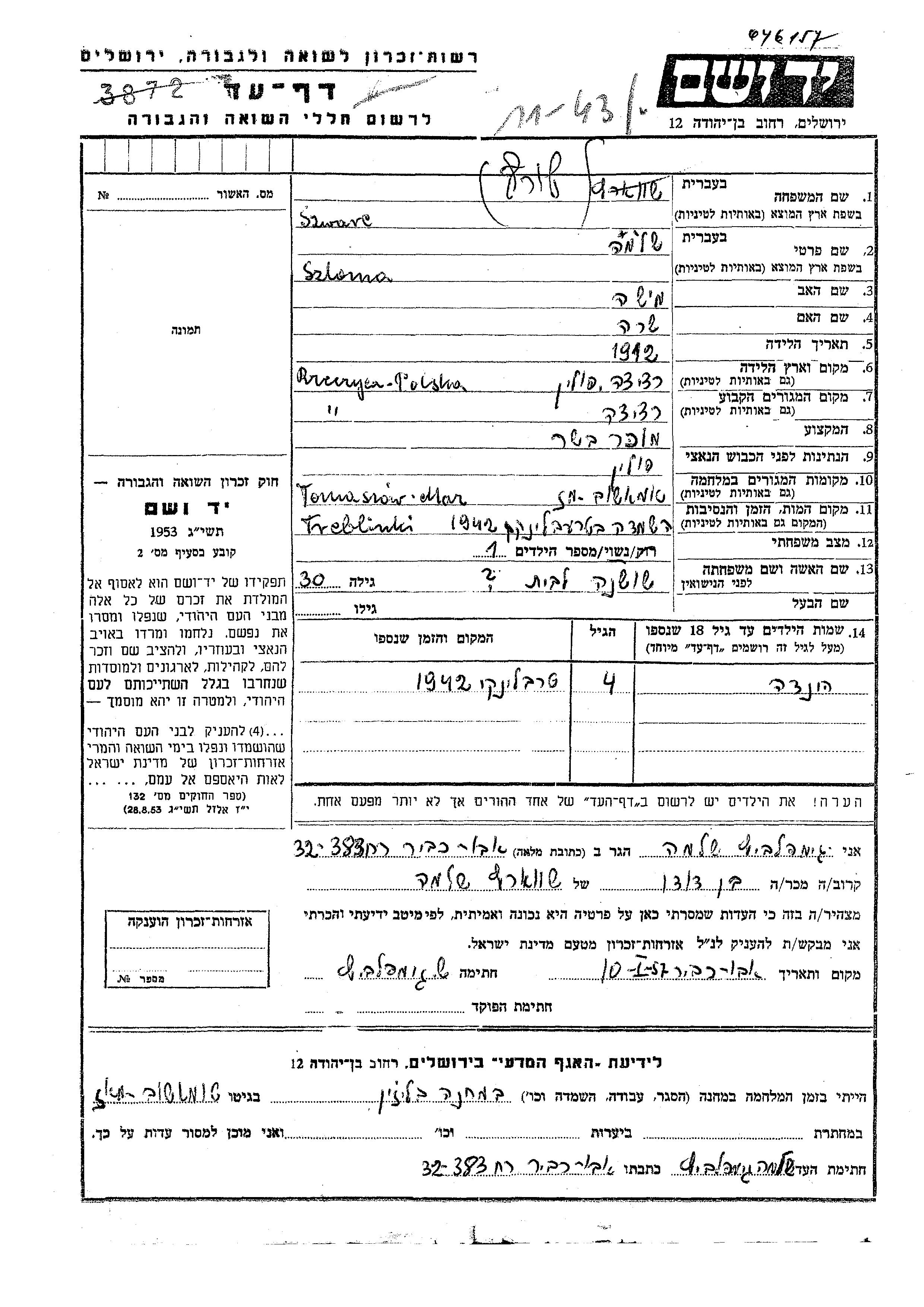 Шварц Шлома 1912 Жечица, Польша Лист свидетельских показаний