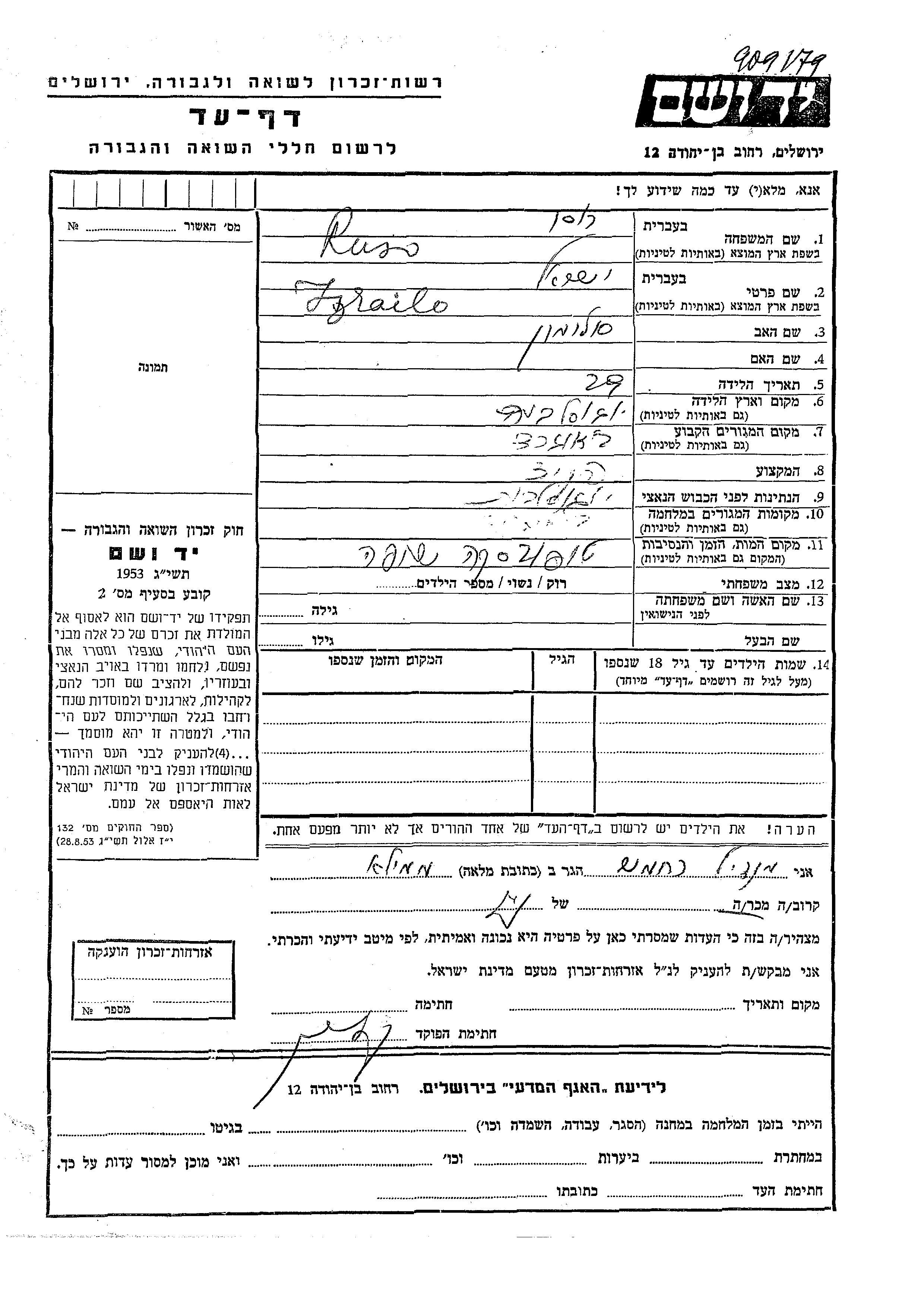 Русо Израило Белград, Югославия Лист свидетельских показаний