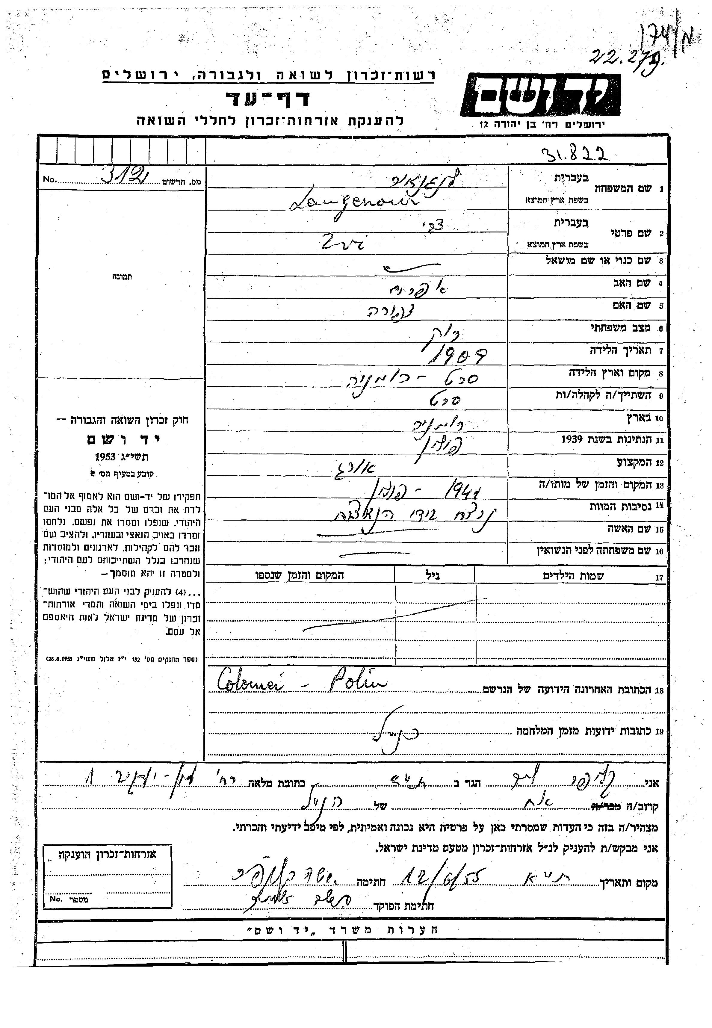 Лангеноур Цви 1909 Серет, Румыния Лист свидетельских показаний