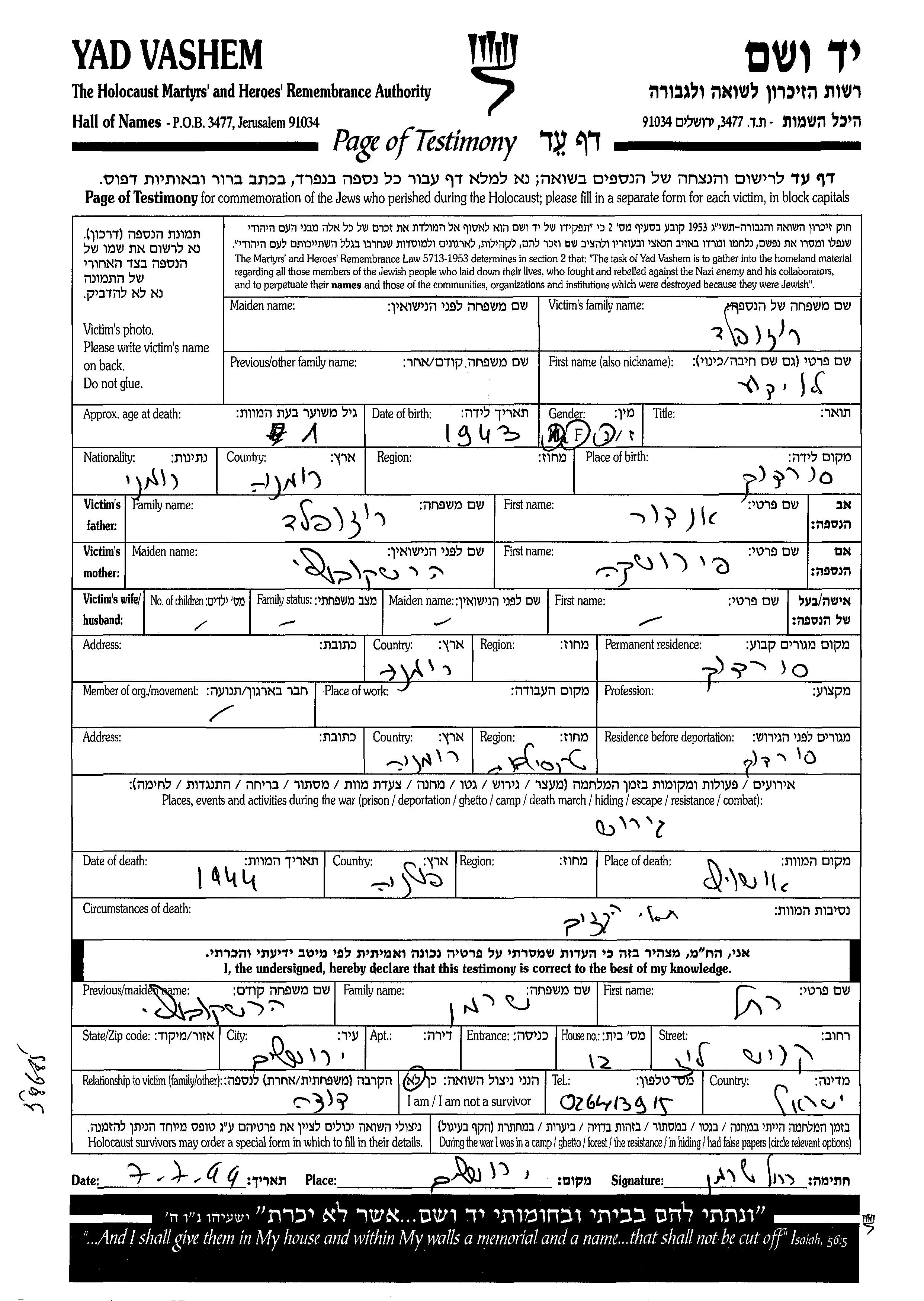 Яд Вашем - Листы свидетельских показаний Мемориального фонда
