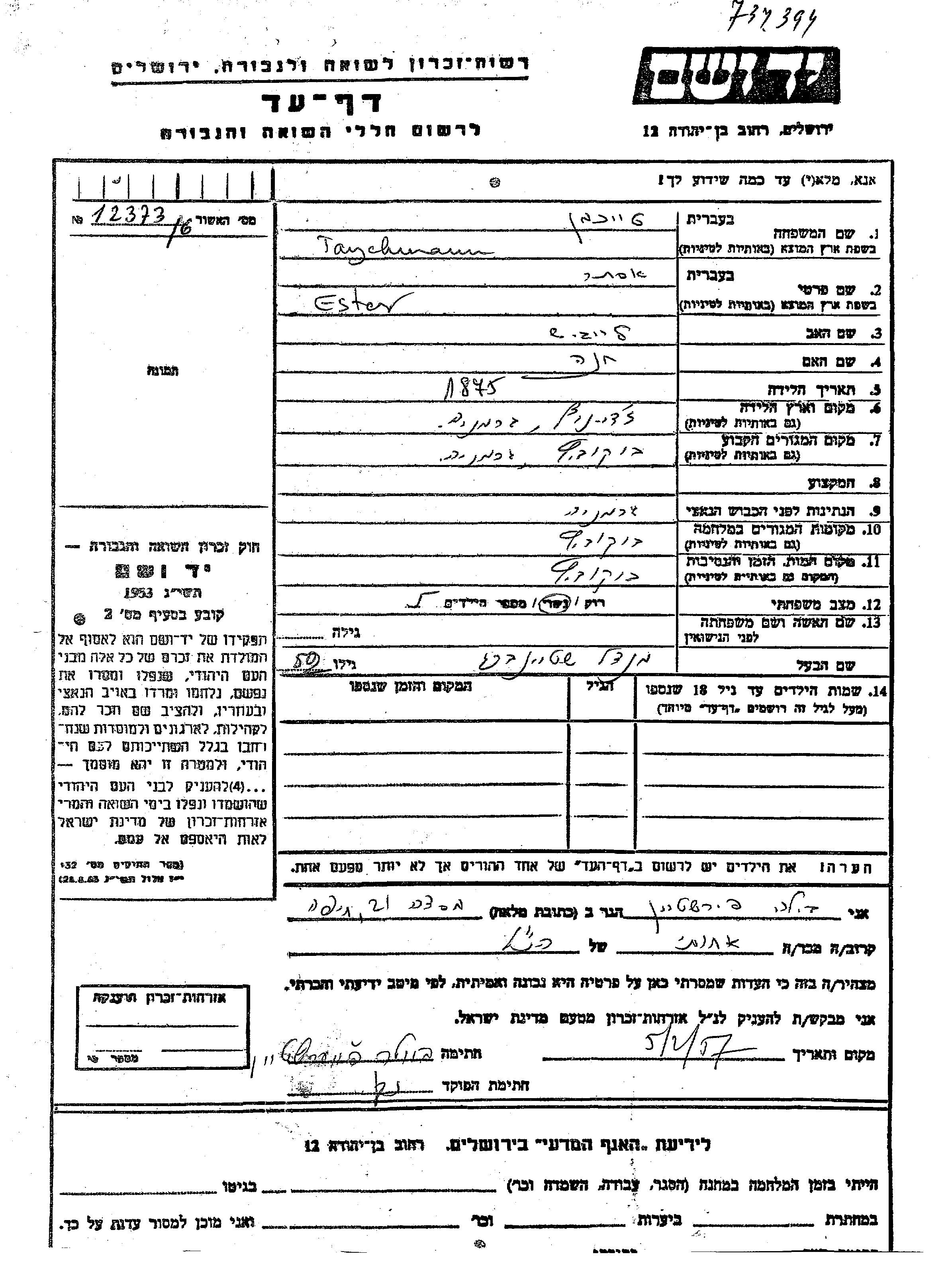 Тайхманн Эстер 1875 Буковице, Польша Лист свидетельских показаний