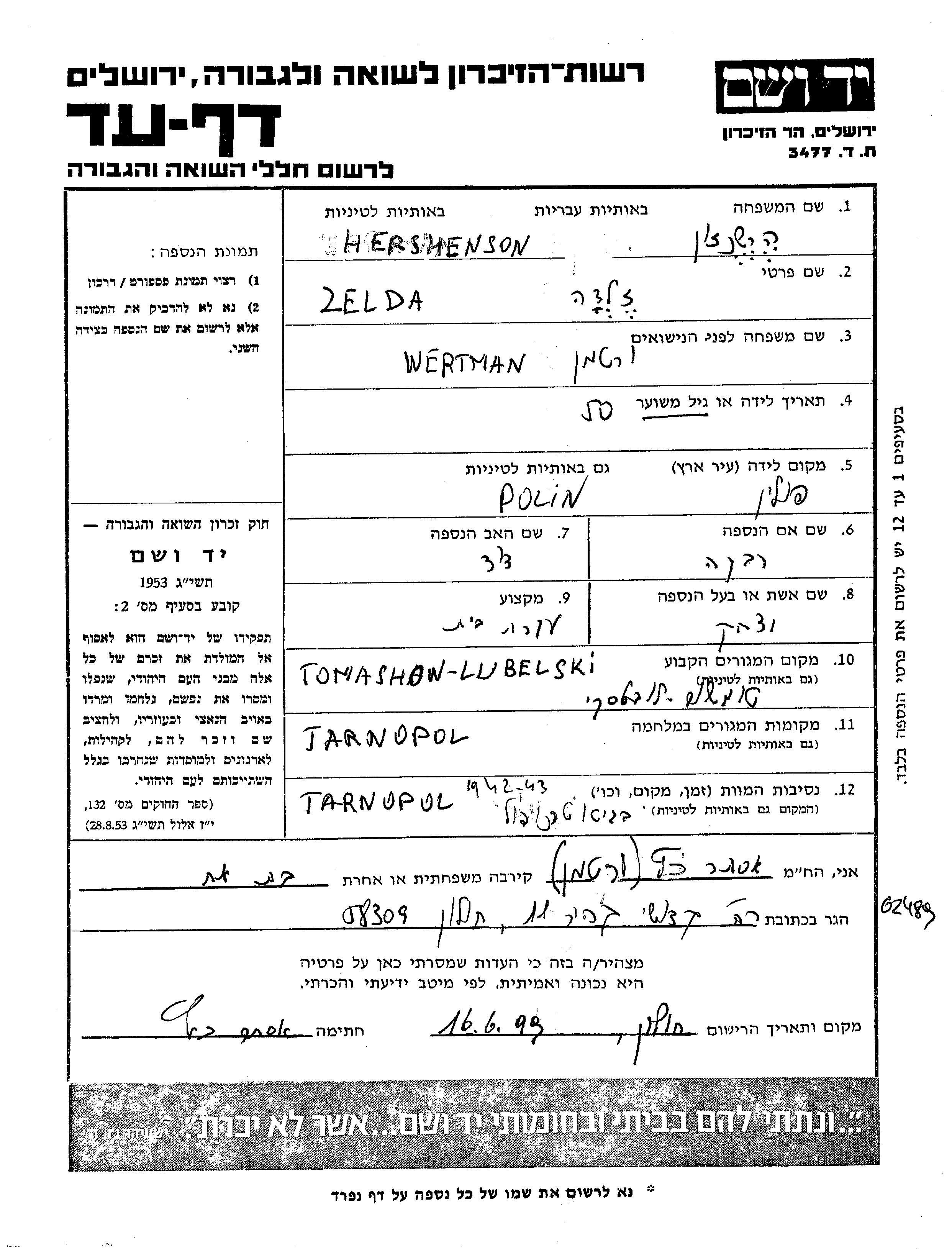 Хершензон Зельда Томашув-Любельски, Польша Лист свидетельских показаний