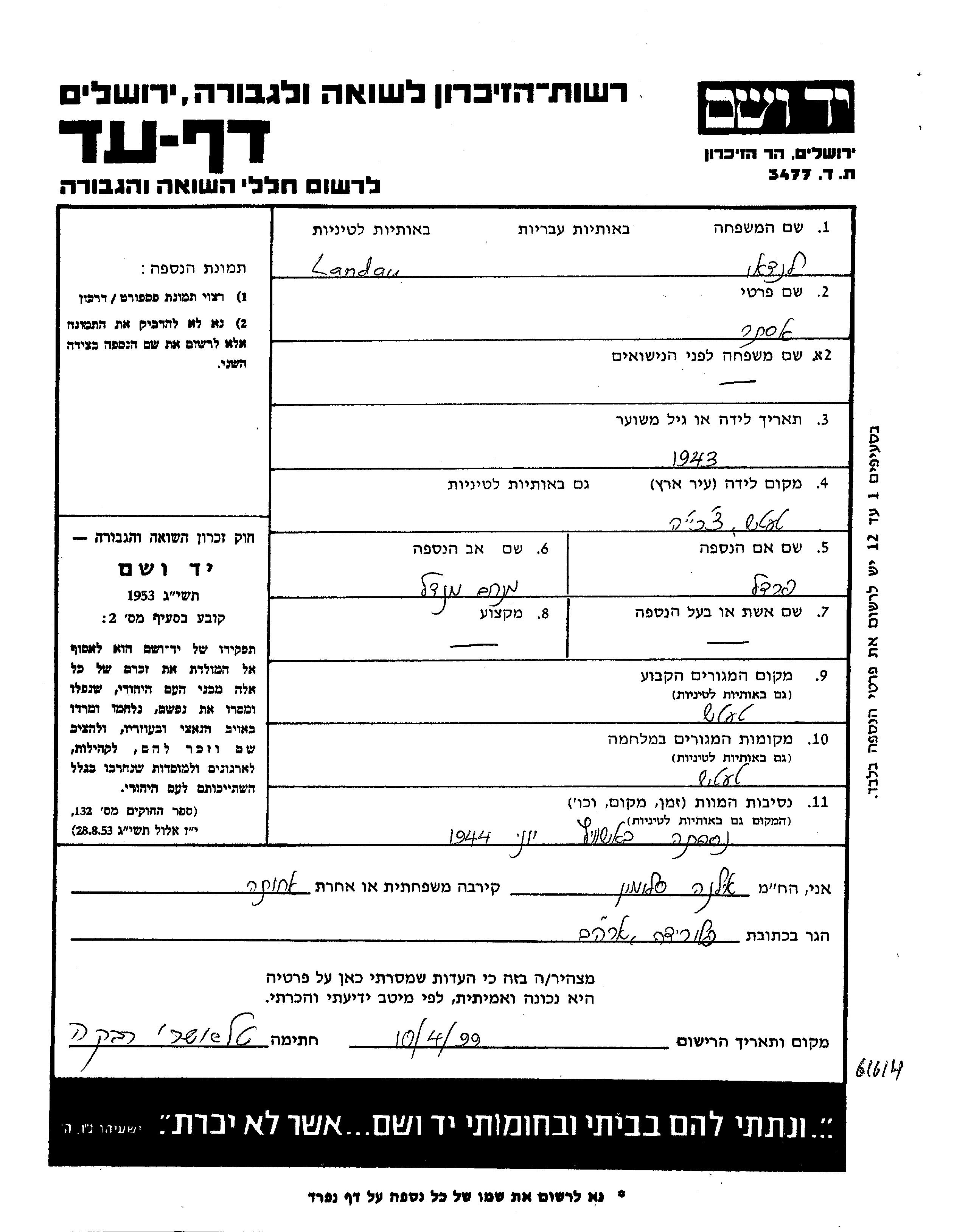 Ландау Эстер 1943 Tatsic, Чехословакия Лист свидетельских показаний