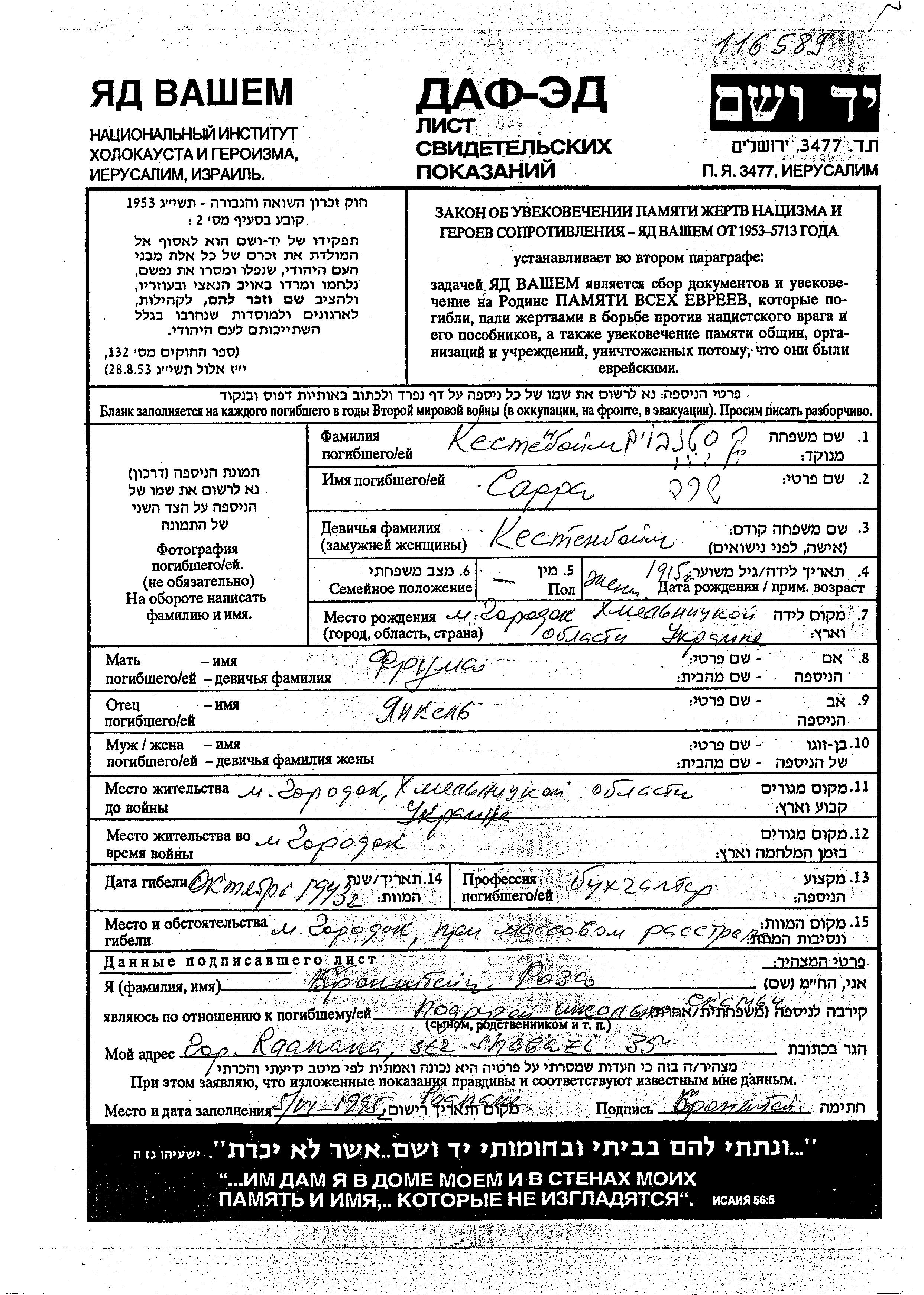 Кестенбойм Сара 1915 Городок, Украина (СССР) Лист свидетельских показаний