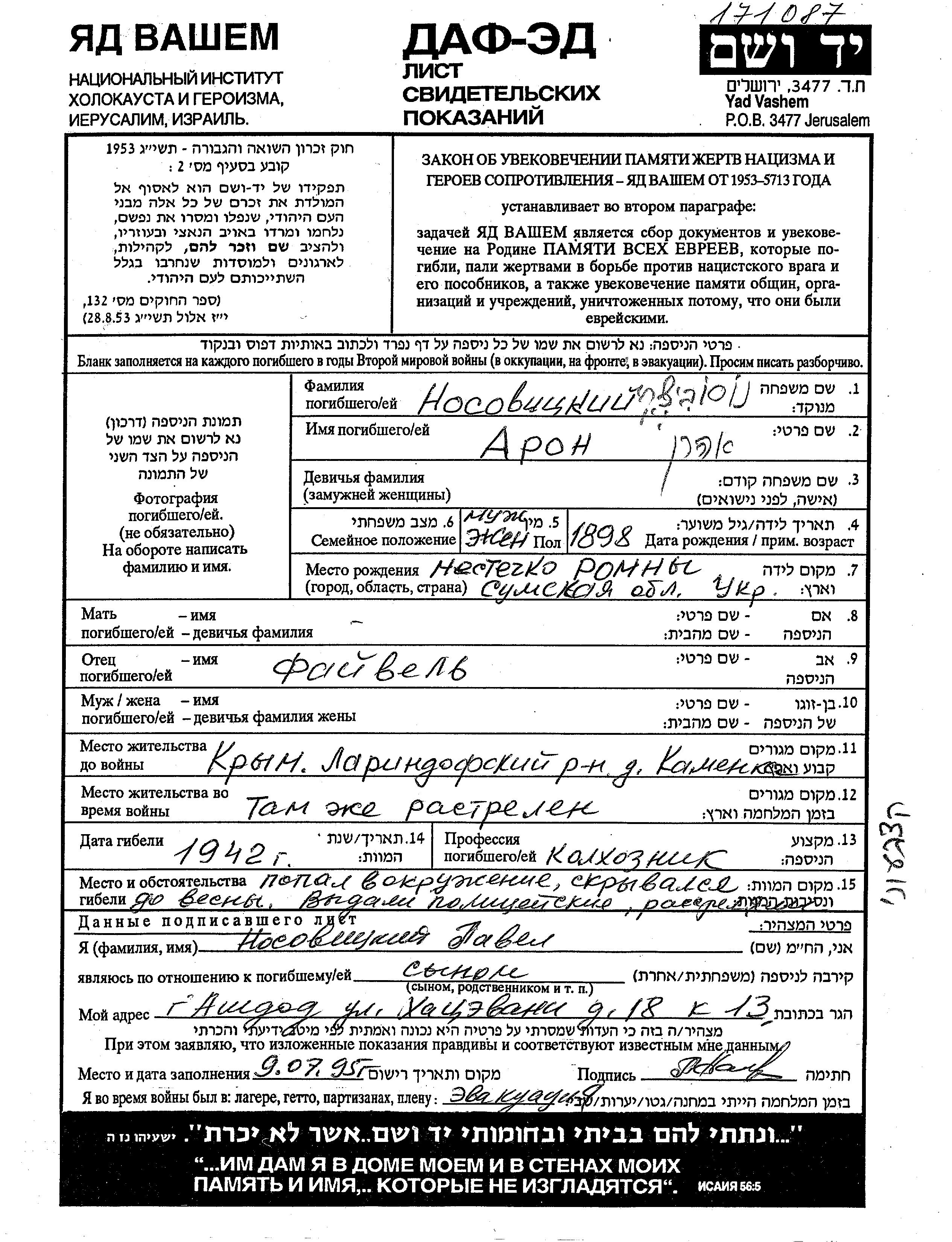 Арон Носовицки, место рождения: Ромны, Украина (СССР). Отец: Файвел. Земледелец / земледелица. Женат / замужем. Место жительства до войны: Каменка, Россия (СССР). Место во время войны: Крымская АССР, Россия (СССР).