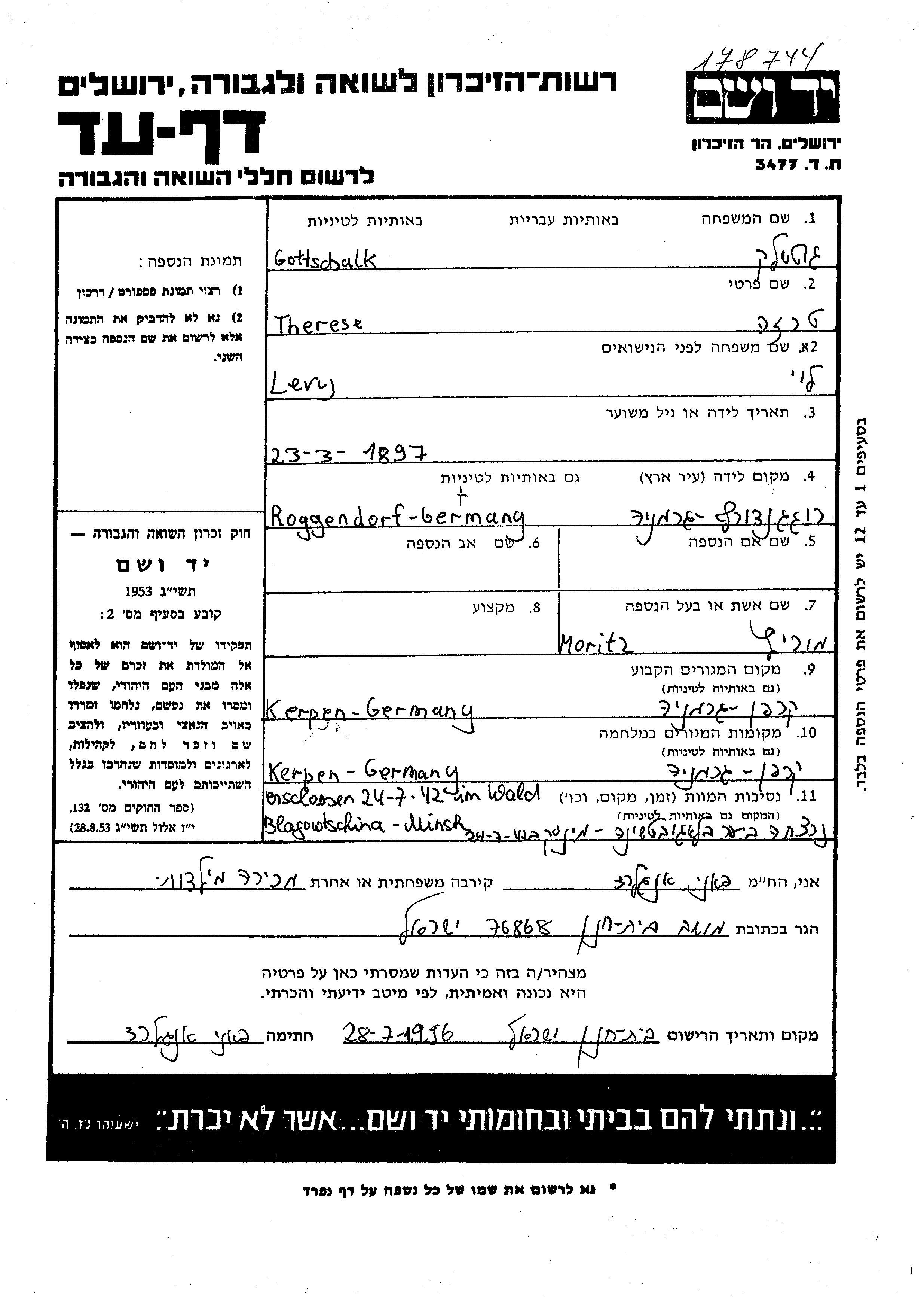 Терезе Готтшальк, девичья фамилия Леви, место рождения: Роггендорф, Германия. Женат / замужем. Место жительства до войны: Керпен, Германия. Место во время войны: Керпен, Германия.
