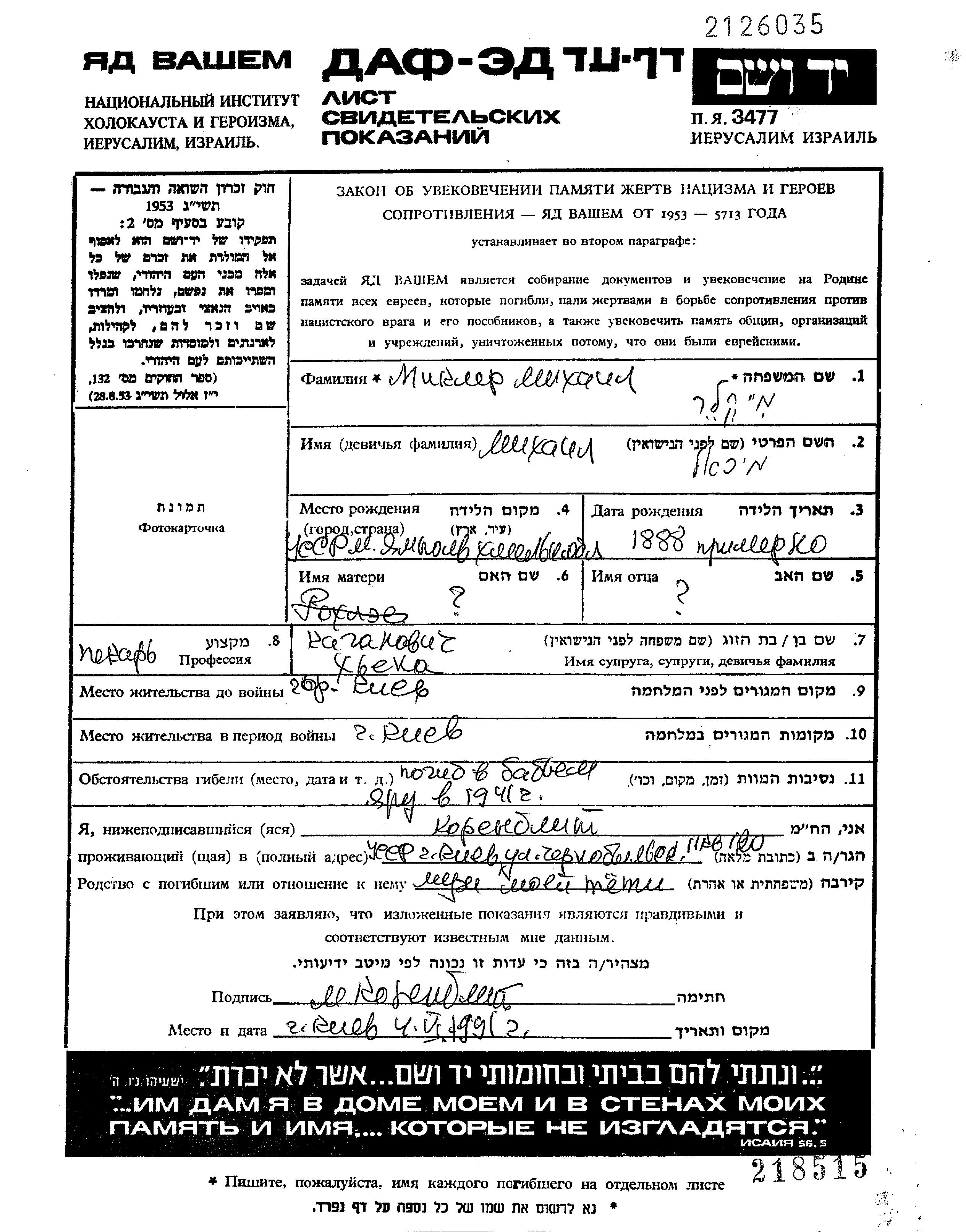 Миклер Михаил 1888 Киев, Украина (СССР) Лист свидетельских показаний