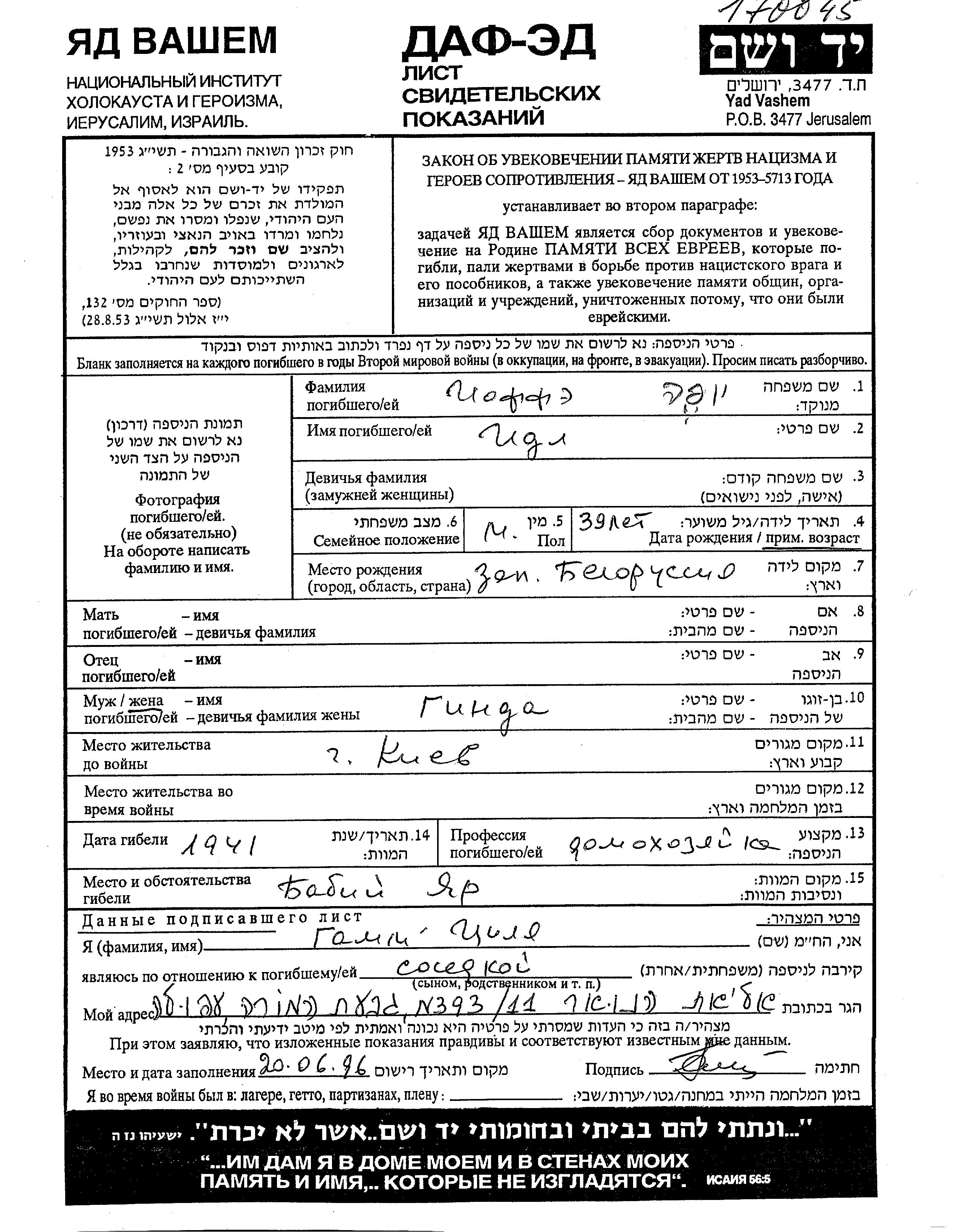 Яд Вашем - Листы свидетельских показаний Мемориального фонда