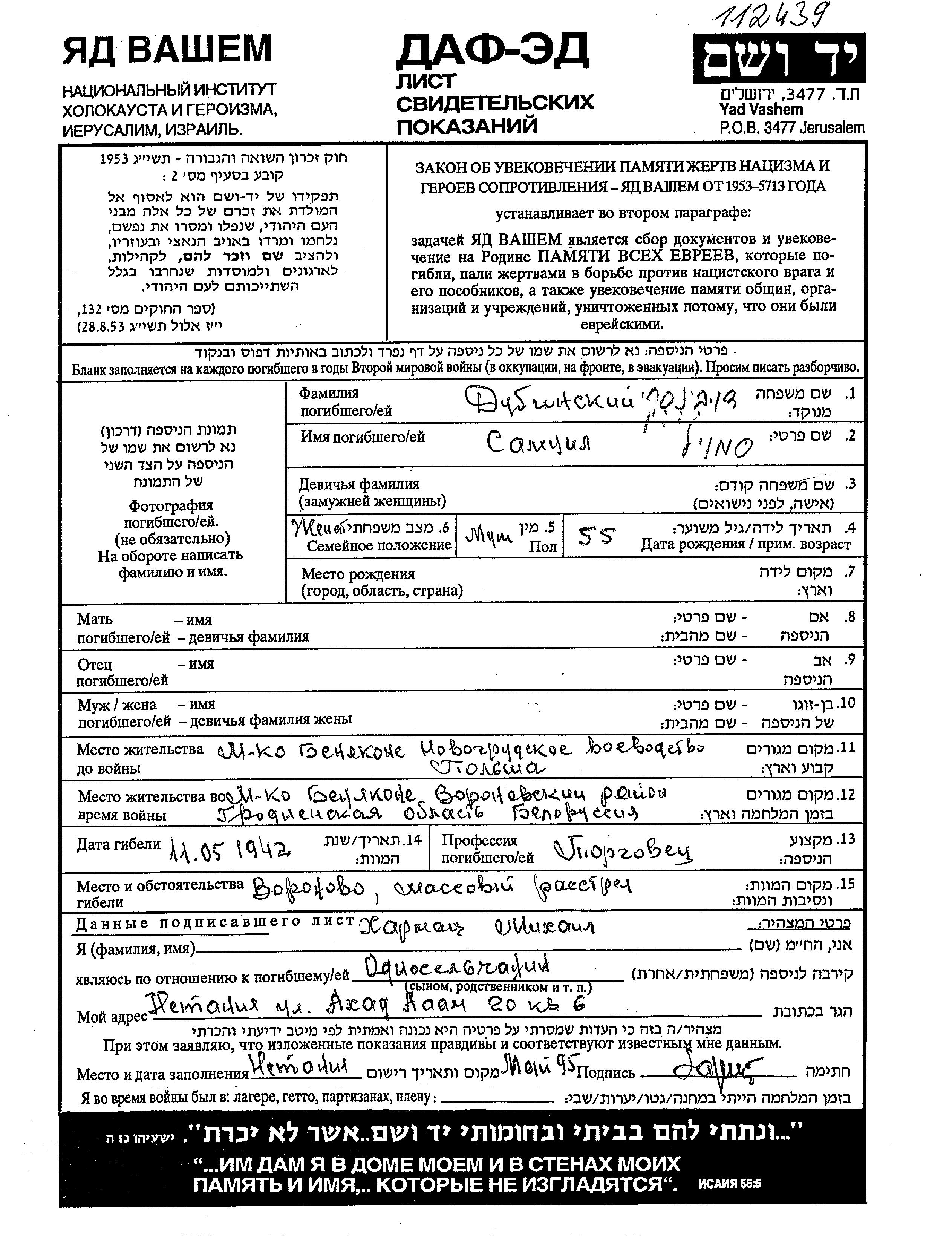 Дубински Самуил 1887 Бенякони, Польша Лист свидетельских показаний