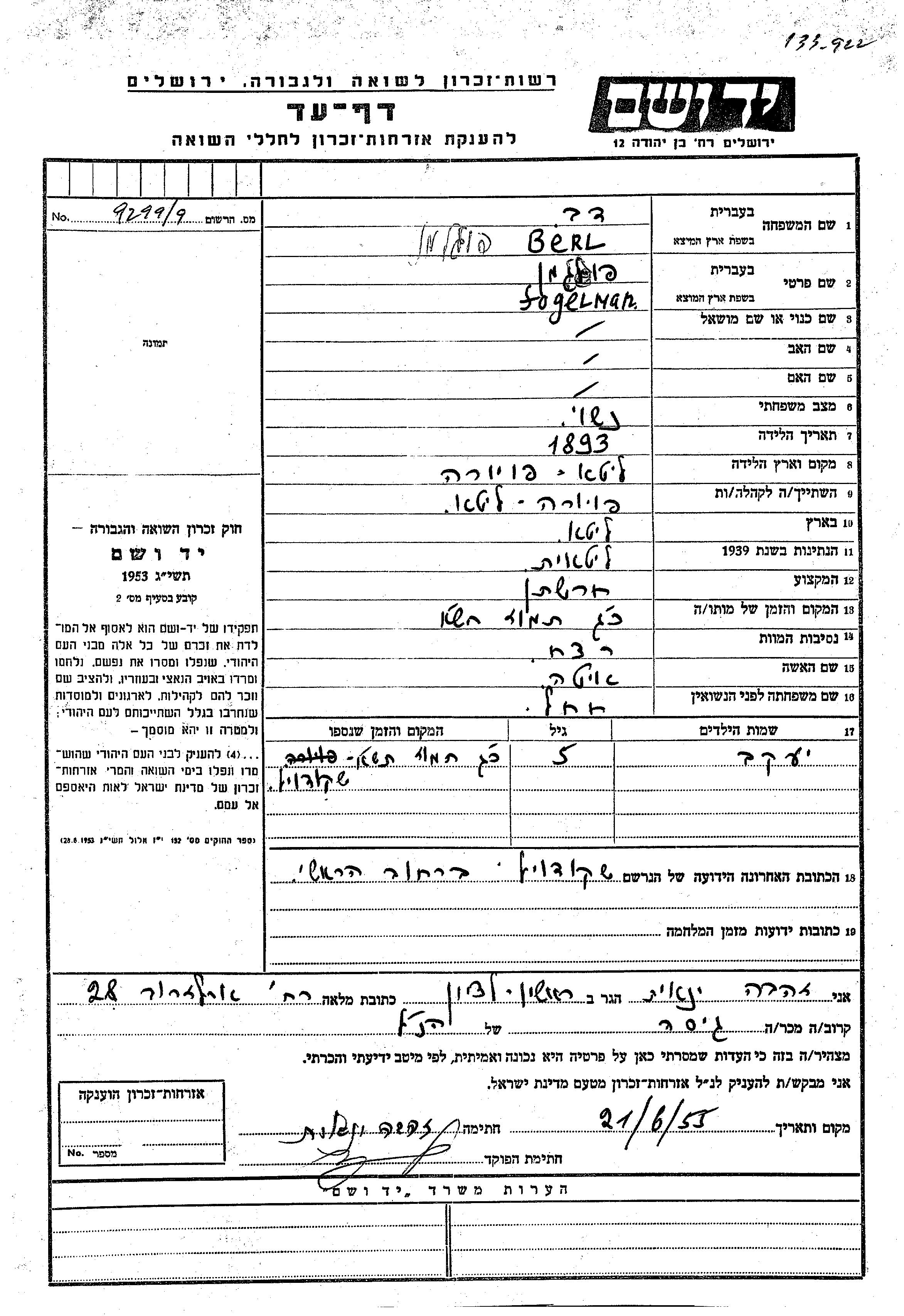 Берл Дов Фогельман, место рождения: Пайора, Литва. Фабрикант. Женат / замужем. Место жительства до войны: Пайора, Литва. Место во время войны: Пайора, Литва.