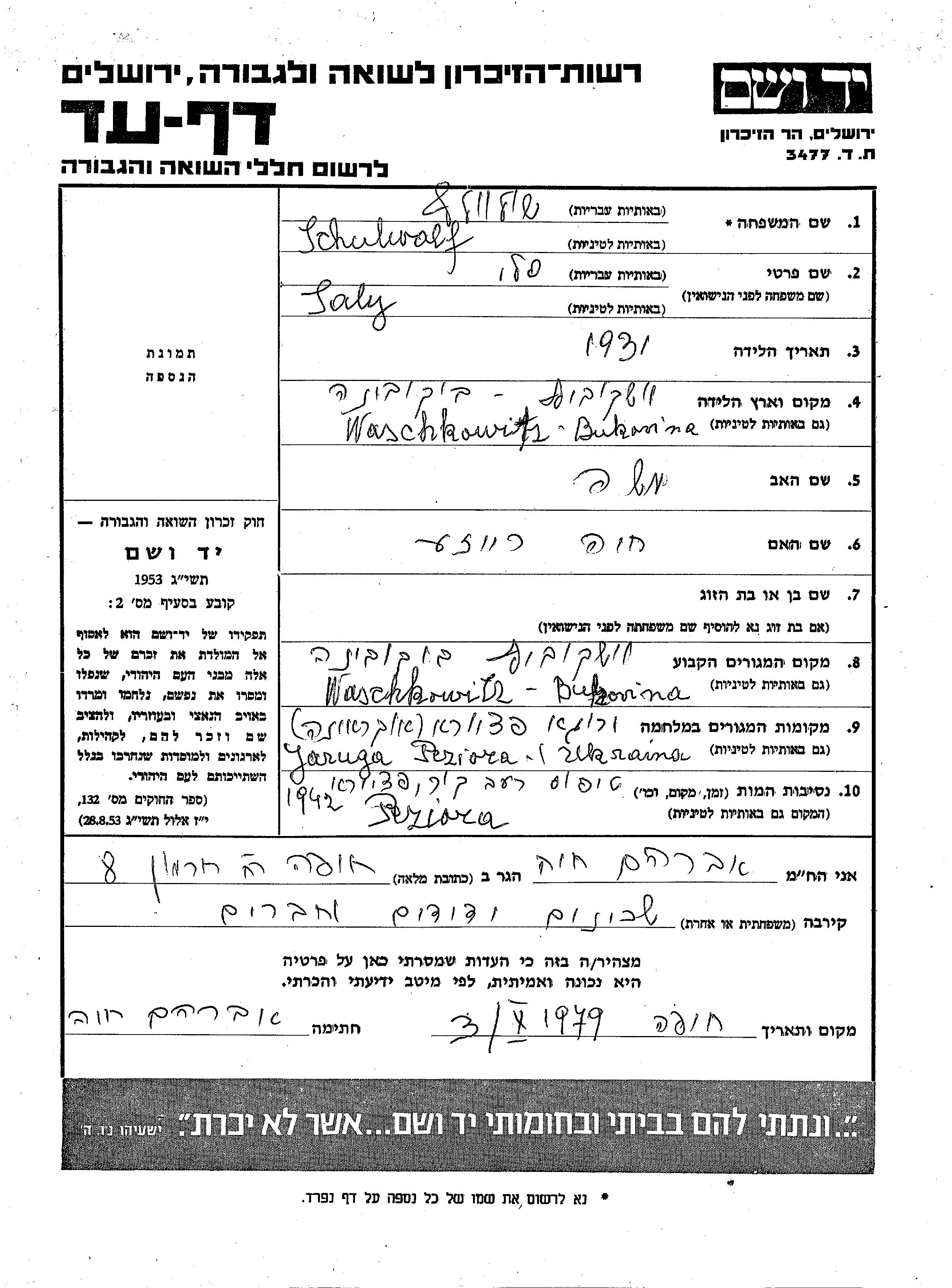 Шульвольф Сали 1931 Вэскэуць, Румыния Лист свидетельских показаний