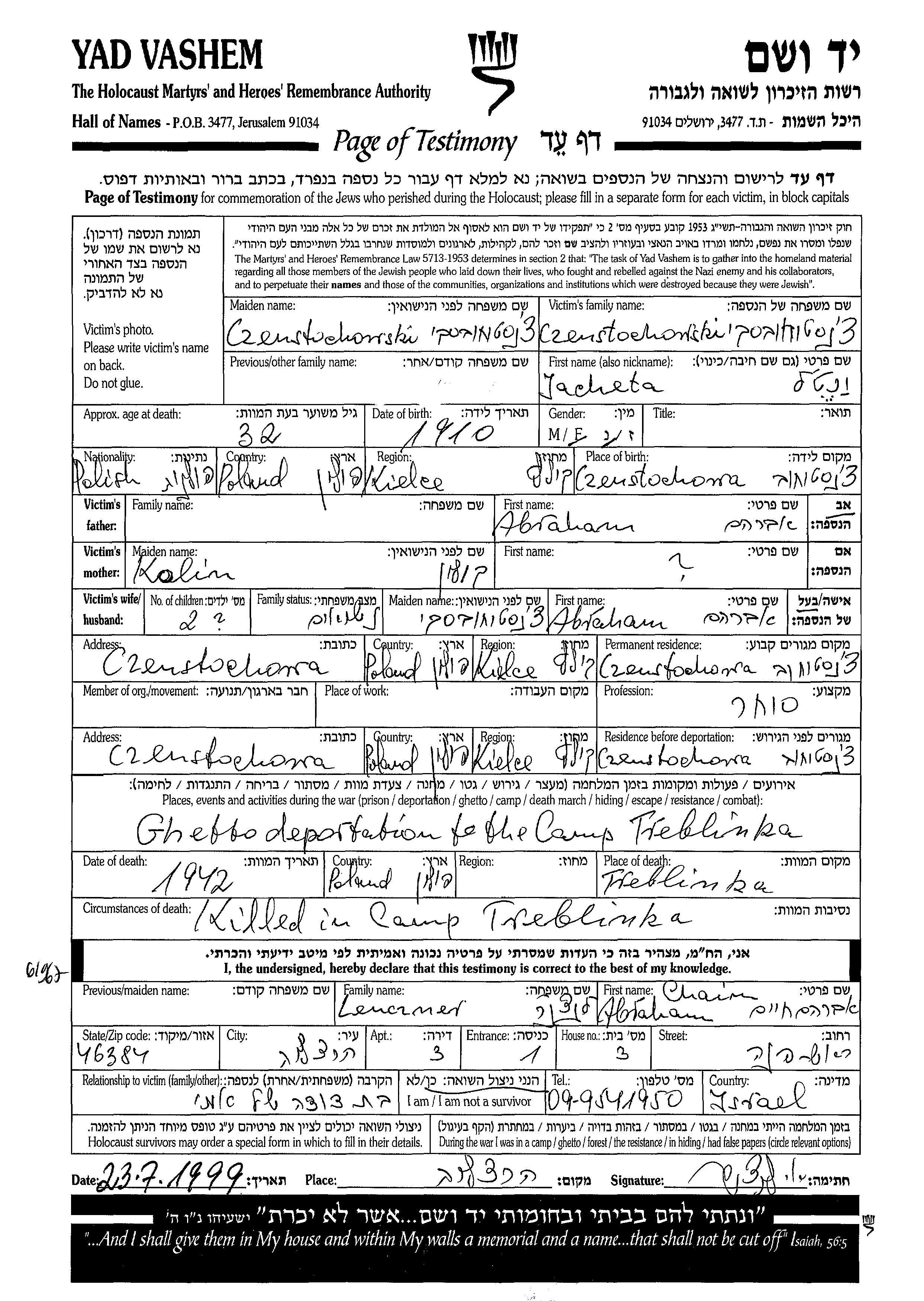 Яхета Ченстоховски, место рождения: Ченстохова, Польша. Отец: Абраам. Торговец / торговка. Женат / замужем. Место жительства до войны: Ченстохова, Польша. Место во время войны: Ченстохова, Польша.