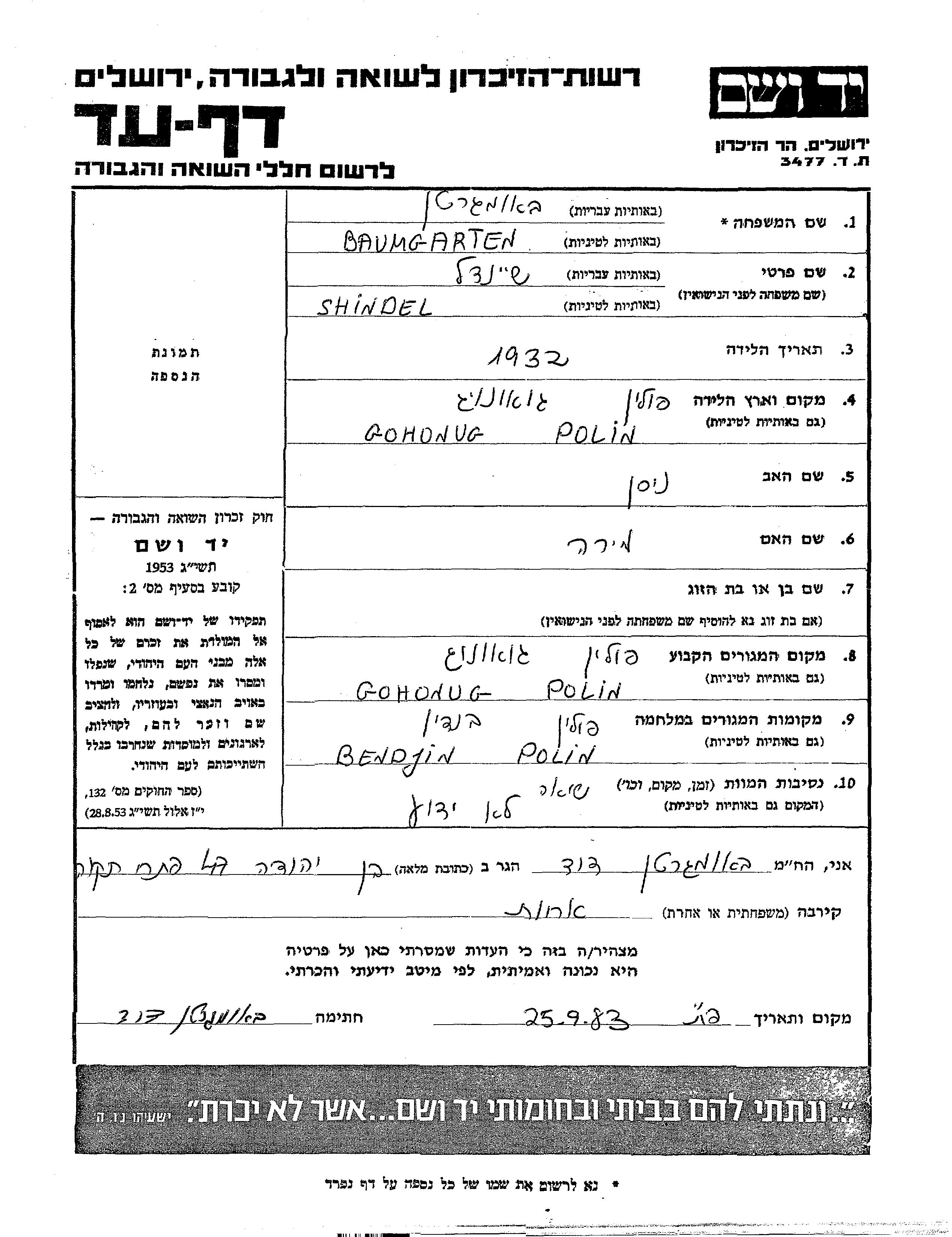 Шейндел Баумгартен, место рождения: Голонуг, Польша. Отец: Нисан, mать:Мира. Место жительства до войны: Голонуг, Польша. Место во время войны: Бендин, Польша.