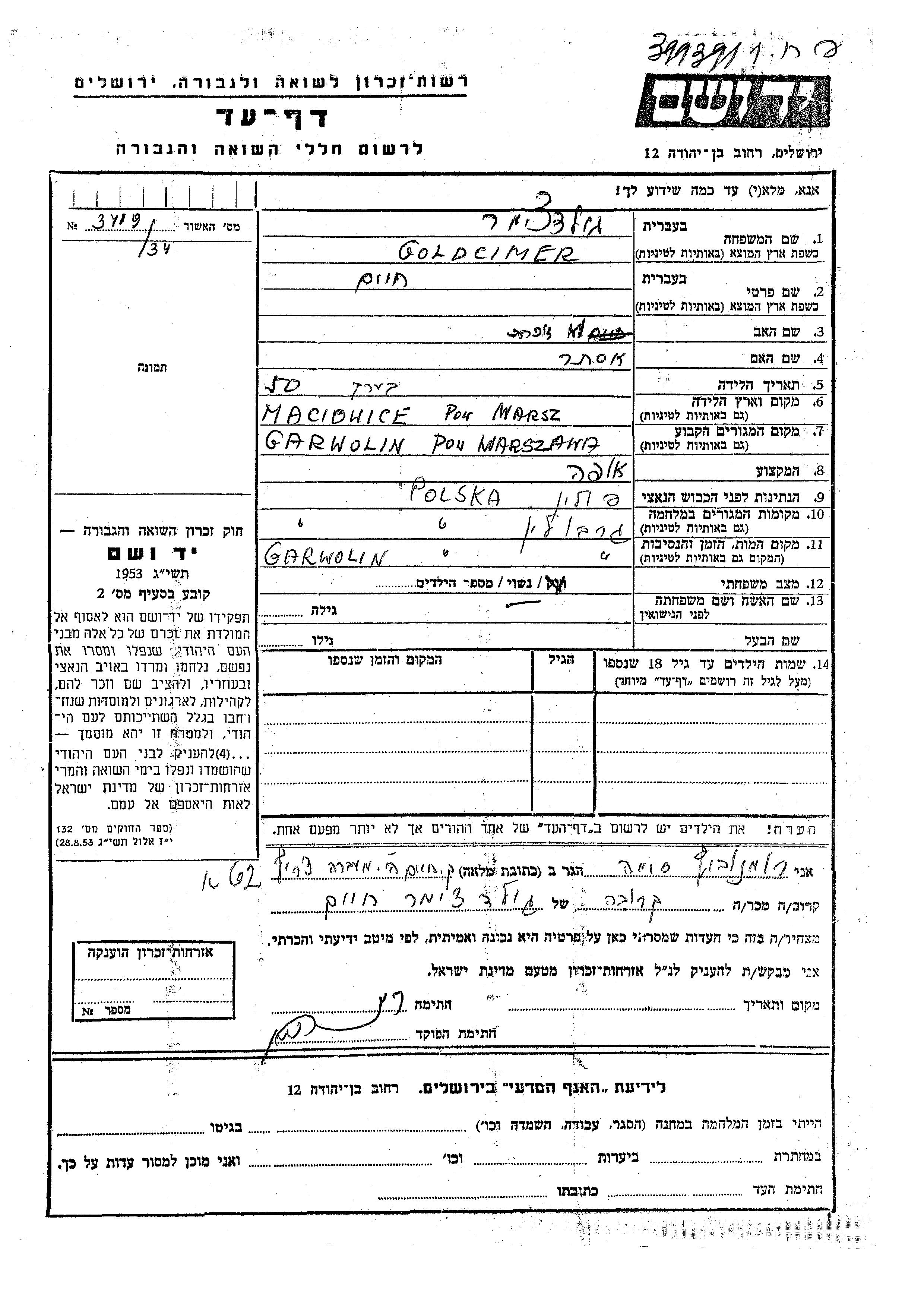 Хаим Гольдцимер, место рождения: Мацеёвице, Польша.Mать:Эстер. Пекарь. Женат / замужем. Место жительства до войны: Гарволин, Польша. Место во время войны: Гарволин, Польша.